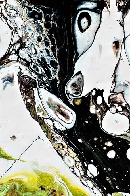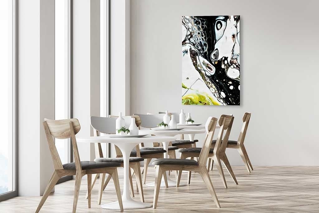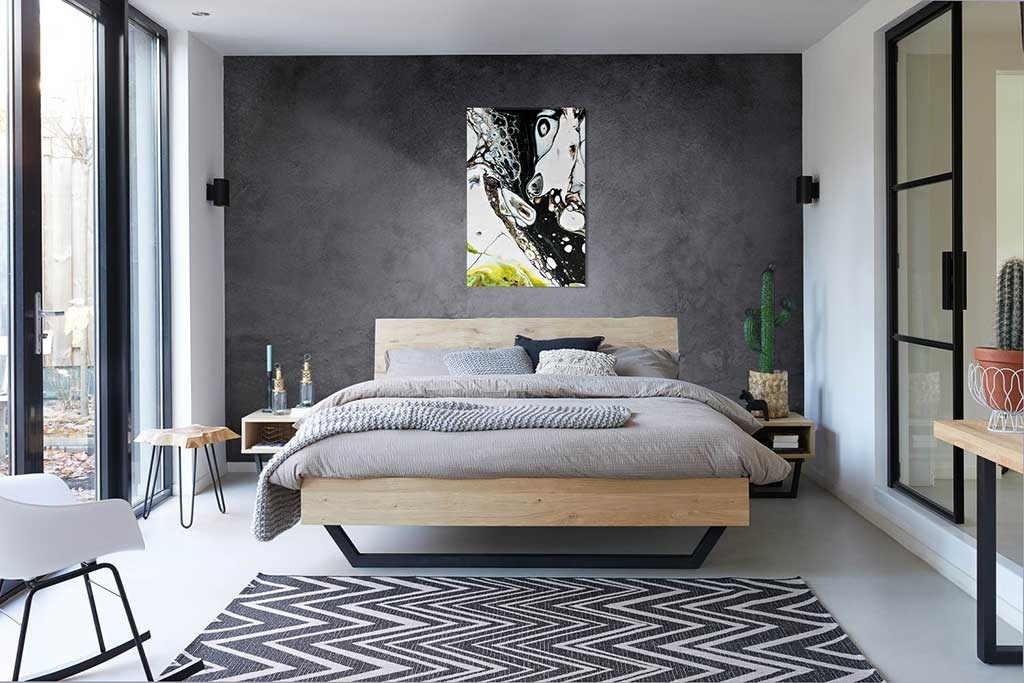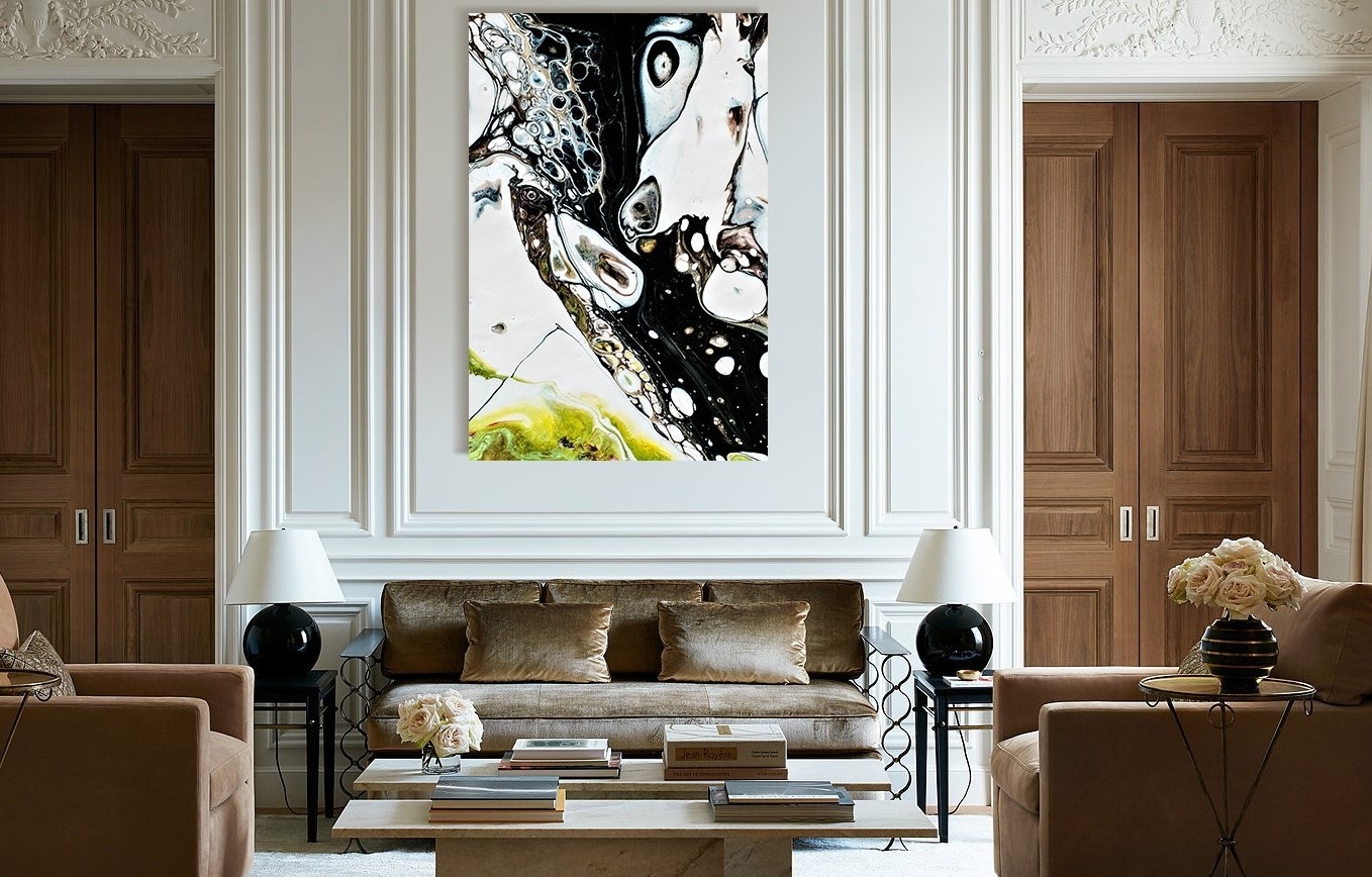 Abstrakte Kunst, schön kombiniert mit ähnlicher Fotokunst, die zu vielen Wohnstilen passt, ergibt ein schönes buntes Ganzes.