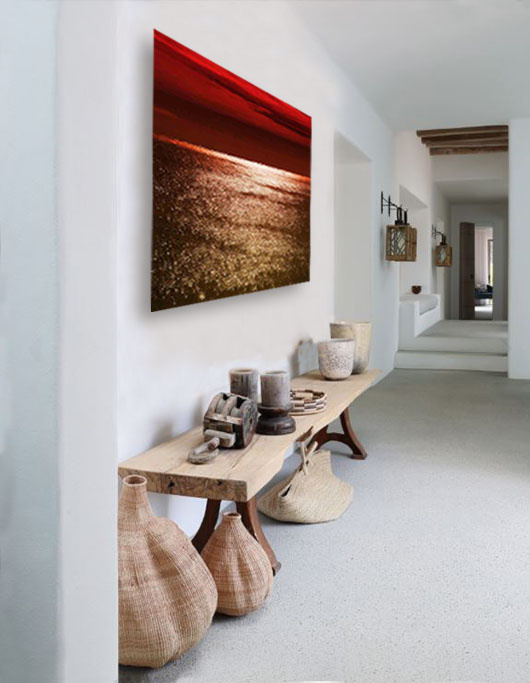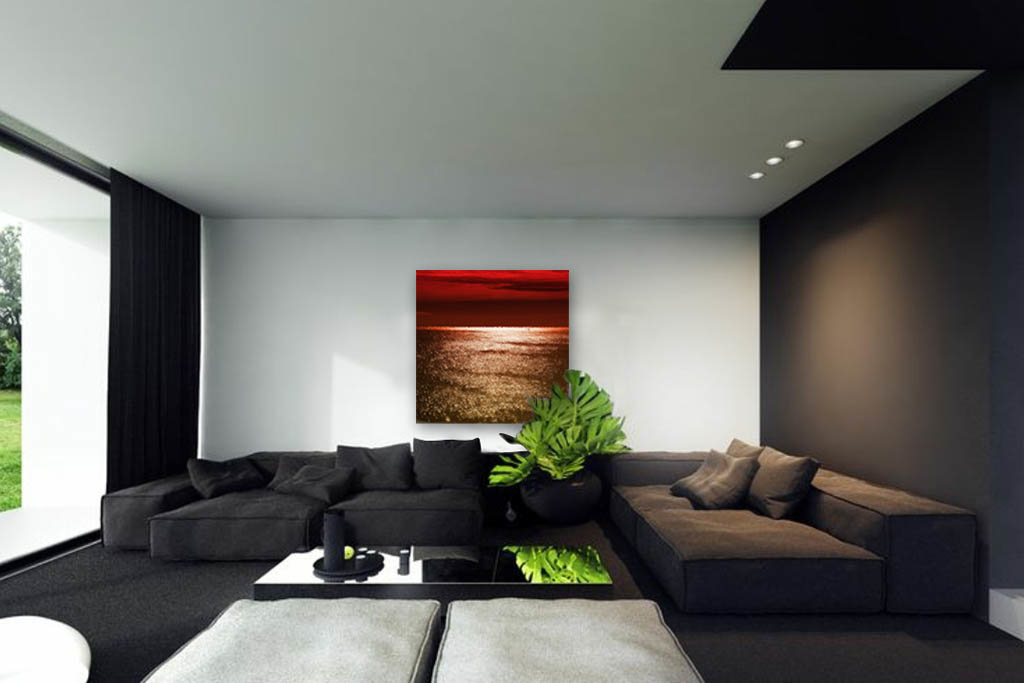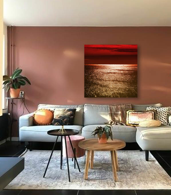 Ein schönes abstraktes Kunstwerk eines Sonnenuntergangs. Der Himmel leuchtet auffallend rot und das Meer scheint voller goldener Funken zu sein. Ein Sonnenuntergang hat immer etwas Magisches, man kann ihn stundenlang beobachten. Mit dieser Fotokunst können Sie Wärme, Ruhe und Harmonie in Ihrem Raum schaffen. Ideal für Wohnzimmer, Flur, Büro oder Schlafzimmer. Abstrakte Kunst ist offen für eine Vielzahl von Interpretationen. Daher ist es wichtig, dass das Kunstwerk Gefühle und Emotionen hervorruft. Die warme Farbpalette macht diese Fotokunst zu einer stilvollen Ergänzung für jedes Interieur.