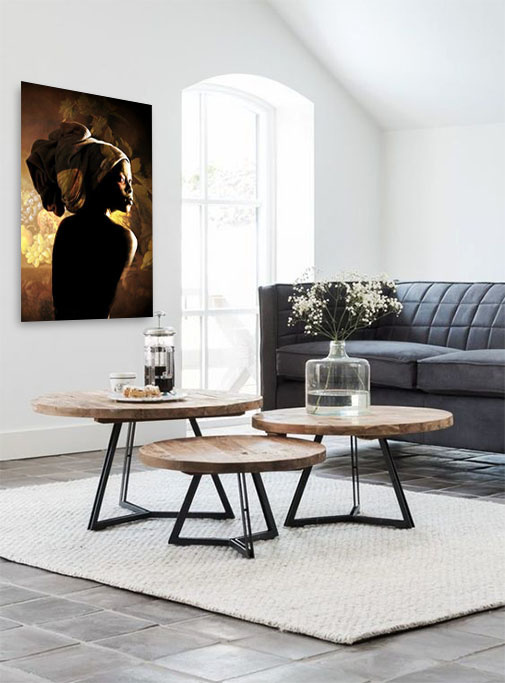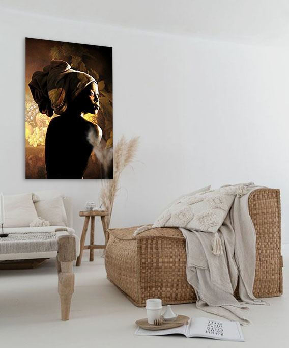 Ein verletzliches Porträt und Profil einer afrikanischen Frau. Die Frau trägt ein Kopftuch und schaut über ihre Schulter. Das Licht fällt auf ihr Gesicht, wodurch ihr Ausdruck wunderschön beleuchtet wird. Im Hintergrund sehen Sie ein kunstvolles Stillleben, dessen Farben wunderbar zum Ganzen passen. Diese Fotokunst ist in jedem Raum schön, vom Wohnzimmer bis zum Schlafzimmer. Eine echte Bereicherung in unserer 'Specials'-Kollektion. Beim Kauf dieser Fotokunst erhalten Sie ein Echtheitszertifikat.