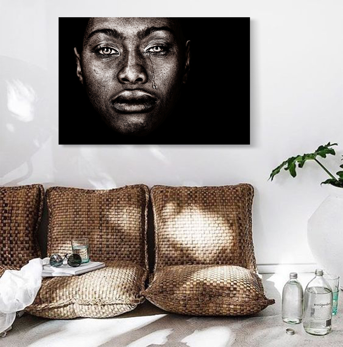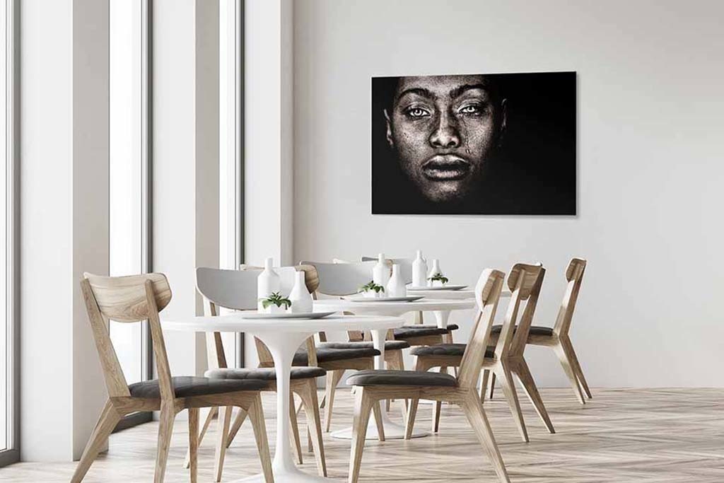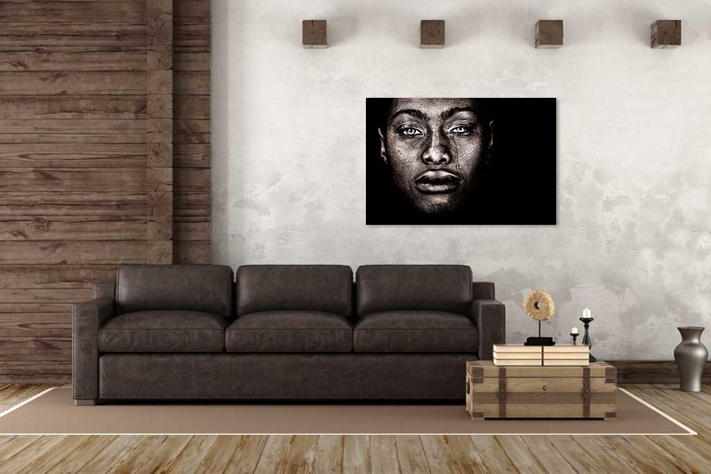 Eine etwas nüchterne Kunst einer dunklen Frau mit schönen, Trauer ausstrahlenden Augen, künstlerisch in schönen Sepia-Tönen wiedergegeben. Schön, dezent, schön an der Wand. Favorit bei vielen Kunstliebhabern.