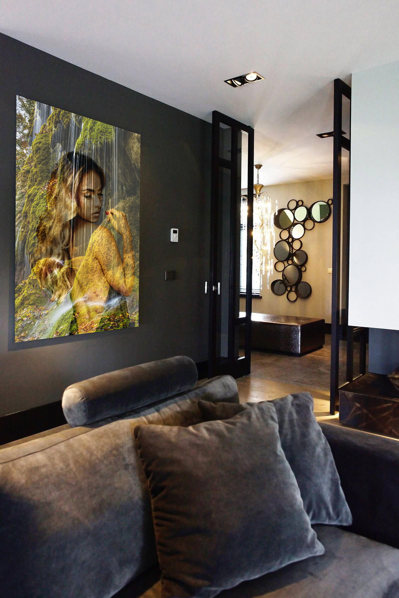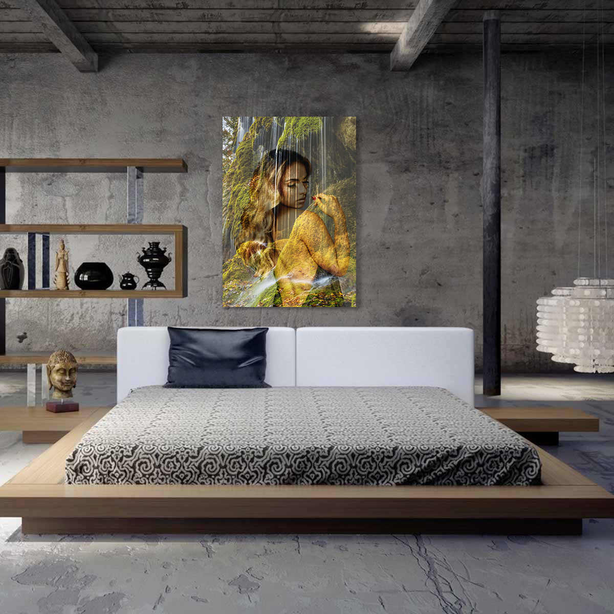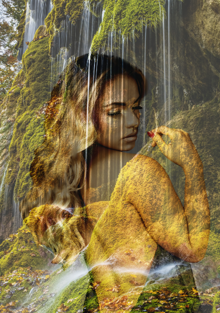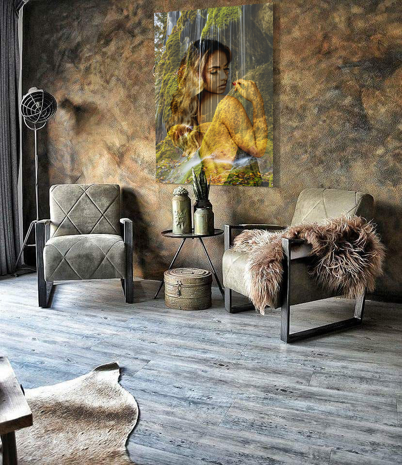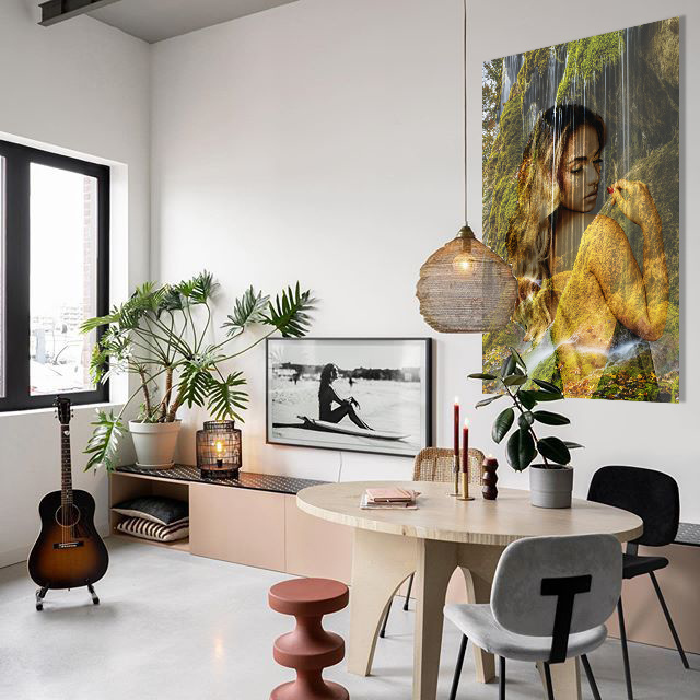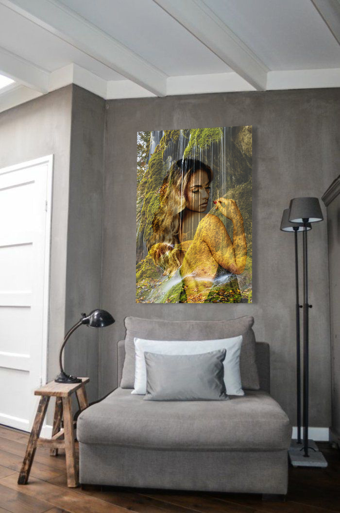 Wasserfälle sind wunderschöne Naturphänomene. Reisen Sie mit dieser 'Aquaholic'-Fotokunst an einen der magischsten Orte der Welt. Neben dem beeindruckenden Wasserfall können Sie auch eine schillernde Frau sehen, die halbtransparent abgebildet ist. Sie wirkt vereint mit der Natur und steht in einer schönen Position. Das ideale Fotokunstwerk für das Bad, Schlafzimmer oder natürlich auch als Blickfang im Wohnzimmer.
