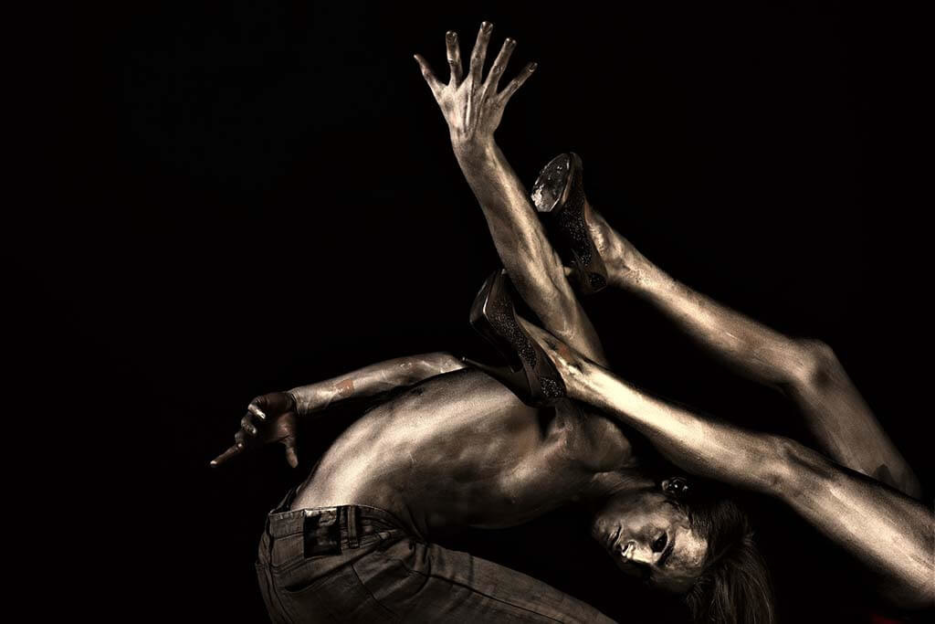 Artistische Kunst in schöner Silberbronze, Mann mit Beinen einer Frau um ihn herum.