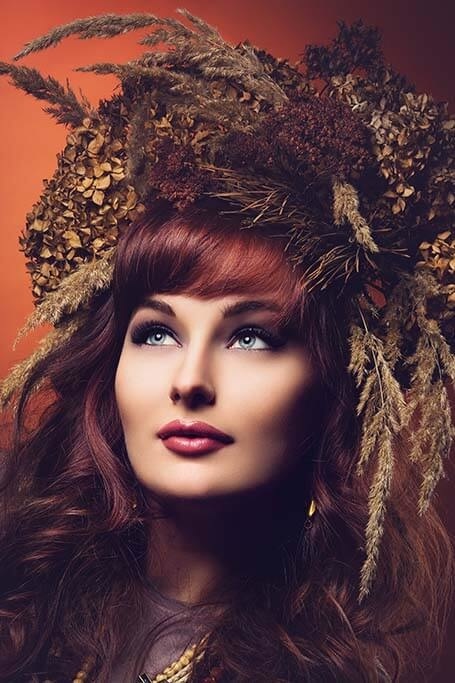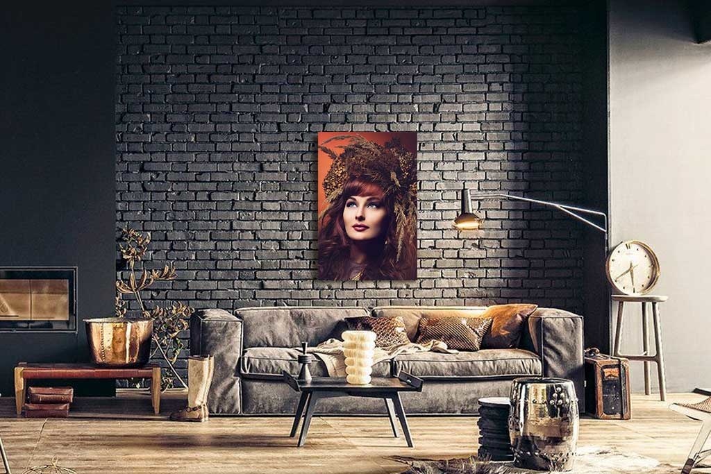 Diese Fotokunst zeigt eine Frau in herbstlichen Farben mit einem auffälligen Hut und wunderschönen Augen, was das Gesamtbild sehr besonders macht.