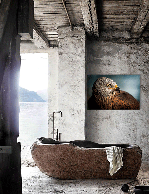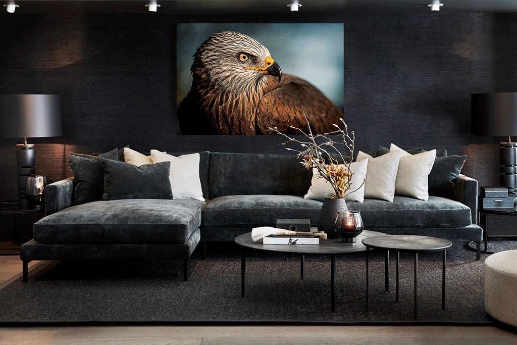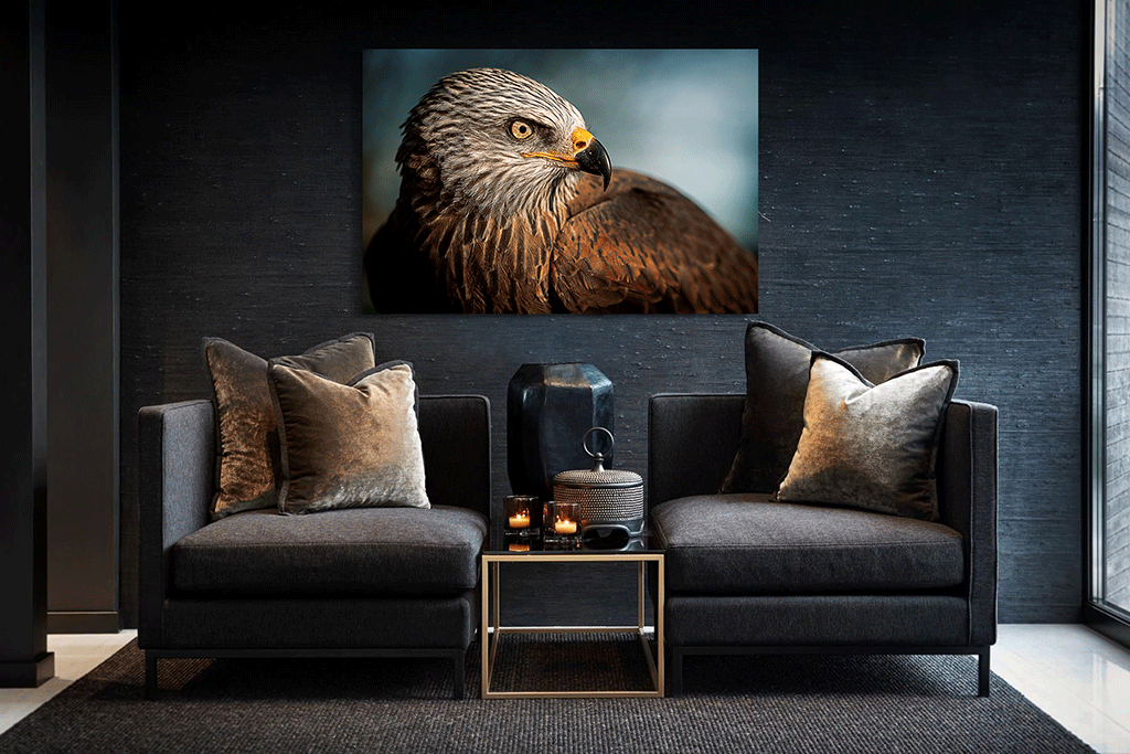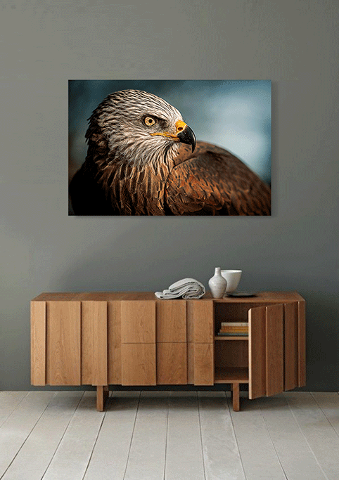 Diese Nahaufnahme eines Adlers ist ein Fest für das Auge. Die vielen Farben und Muster in den Federn machen diese Fotokunst sehr eindrucksvoll und überzeugend. Nicht umsonst ist dieser große Raubvogel ein gängiges Symbol. Der Adler steht für Kraft, Schönheit, Unabhängigkeit und Stärke. Möchten Sie eines dieser schönen Symbole an der Wand haben? Oder lockert das Tier etwas in Ihnen? Hängen Sie diese Fotokunst in Ihren Raum und Sie sind sich eines schönen Blickfangs an der Wand sicher.