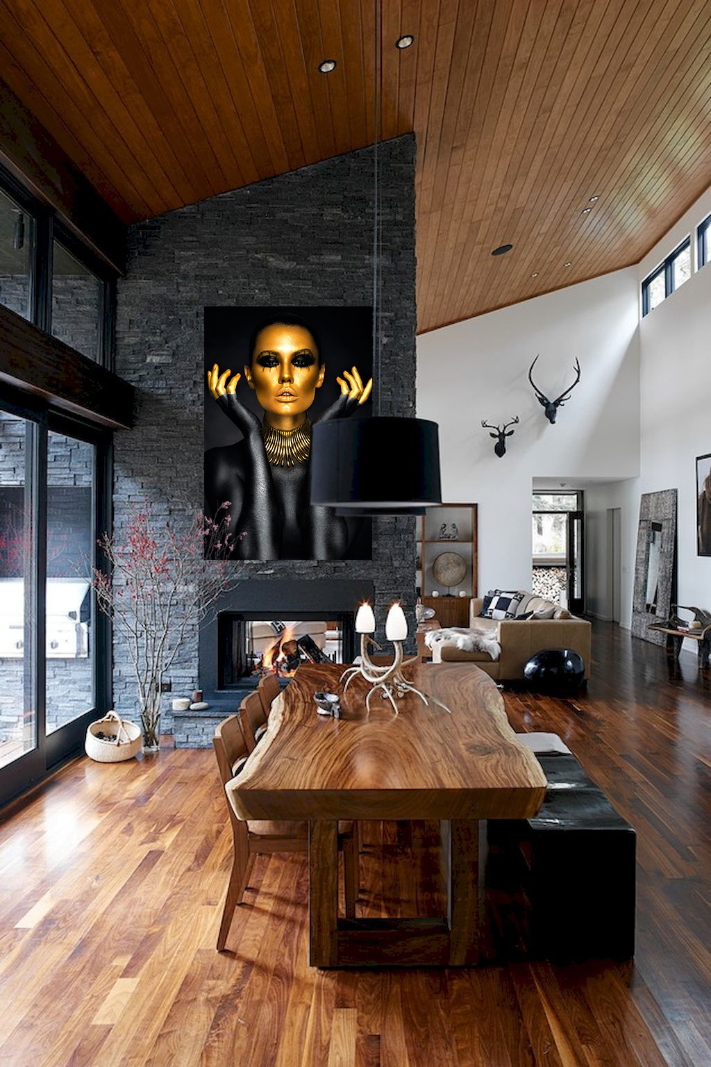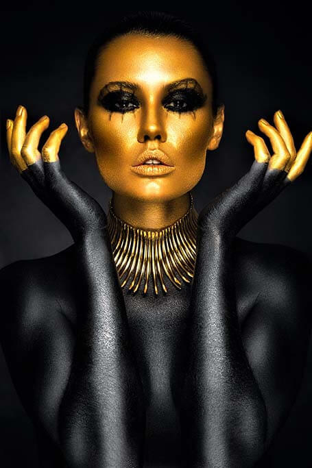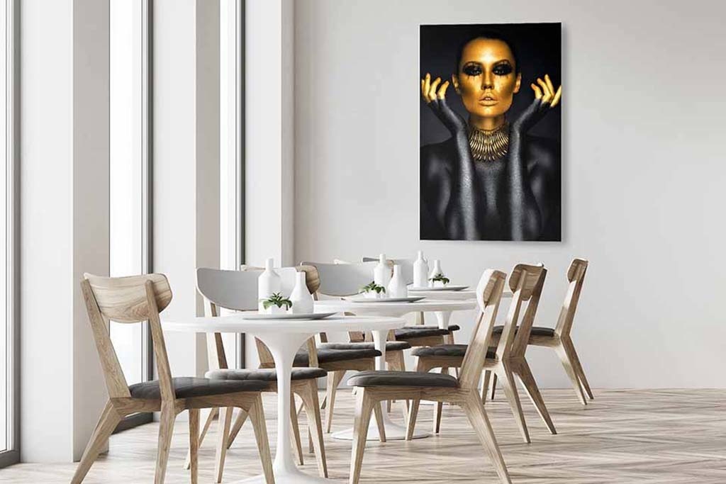 Spezielles Porträt einer Frau, komplett mit schwarzer und goldener Farbe bemalt. Das Gesicht der Frau ist golden, ihr Oberkörper schwarz. Um ihren Hals trägt sie eine große Kette. Ein einzigartiges Porträt, das gut über dem Sofa oder Bett steht. Passt zu jedem Wohnstil.