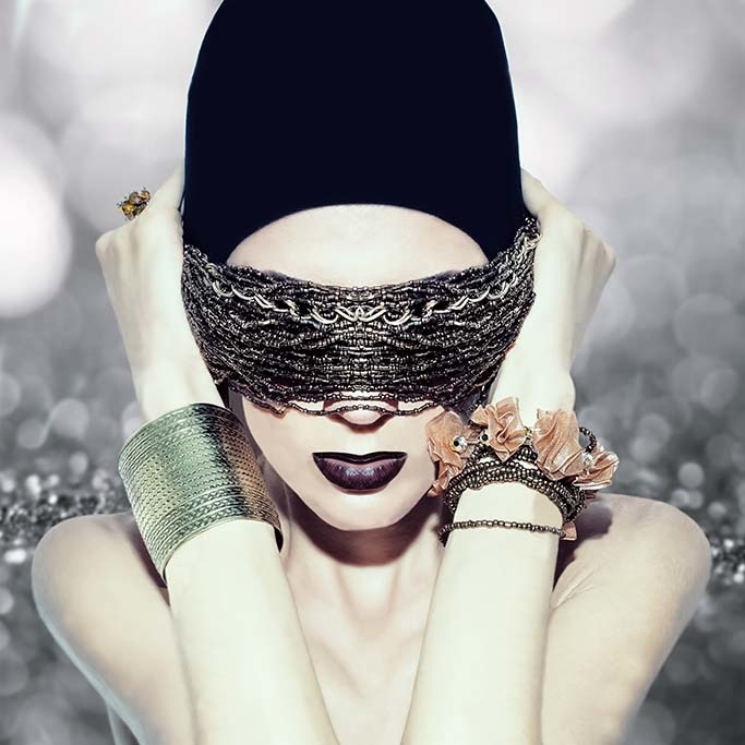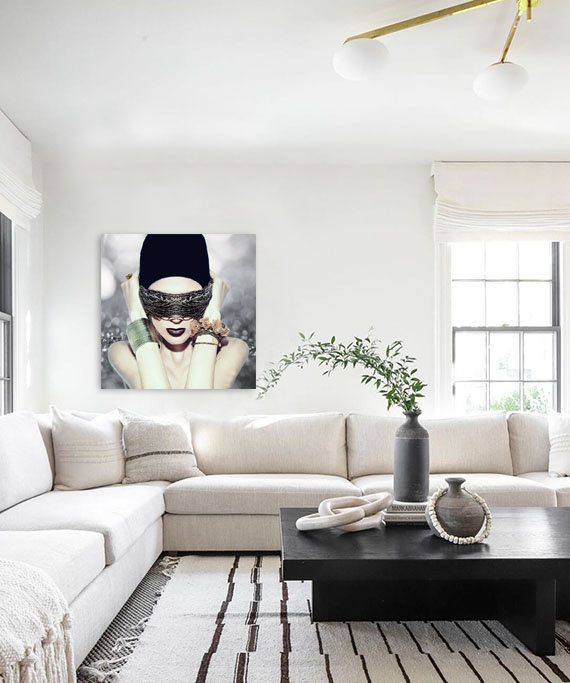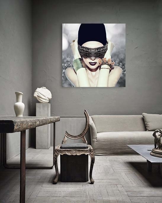 Schönes Bild einer Frau mit verbundenen Augen. Schöne Farbkombination, schöne Kunst für jeden Wohnstil.