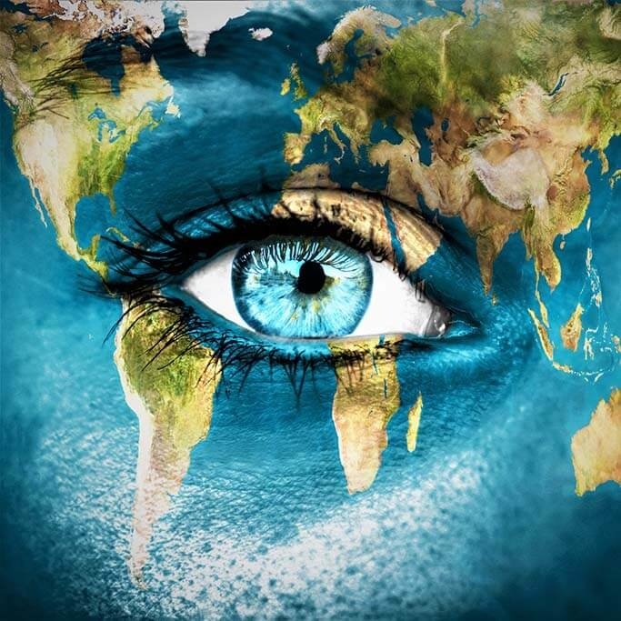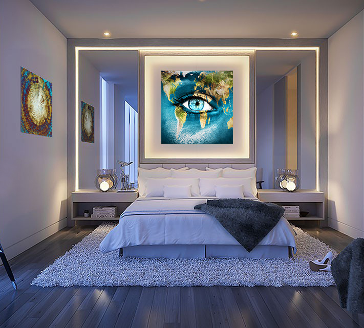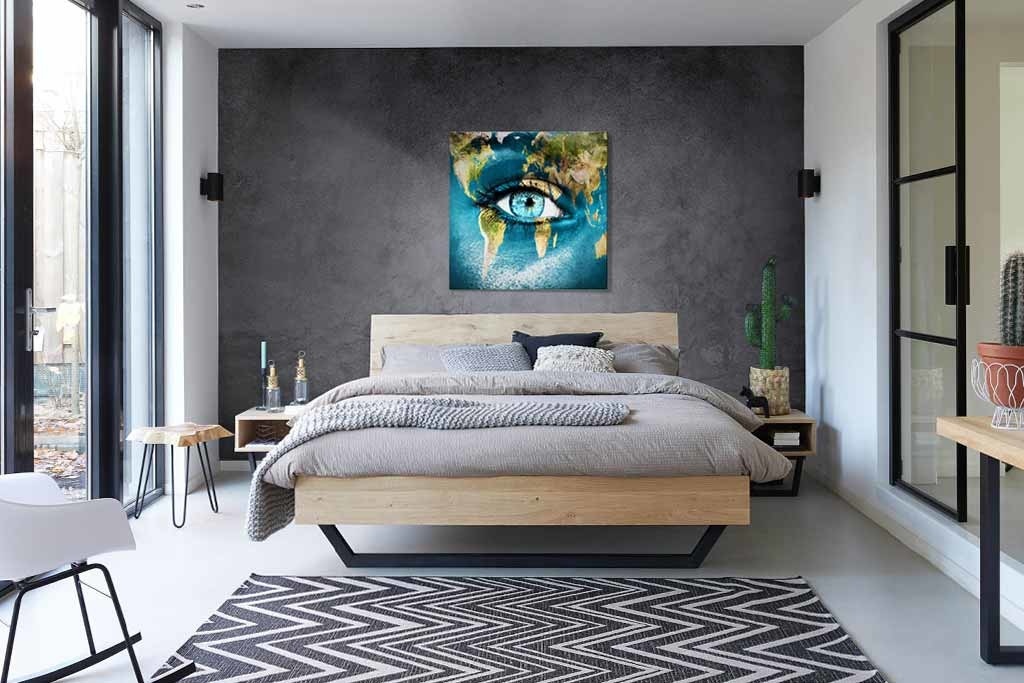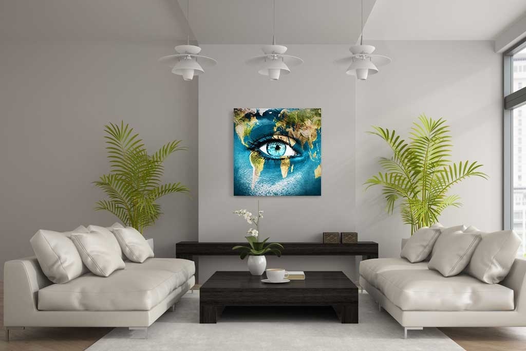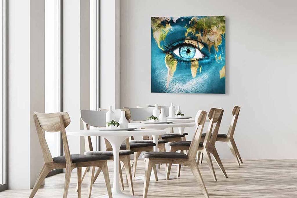 Interessantes Bild eines Auges. Die hellblauen Augen ziehen sofort alle Aufmerksamkeit auf sich. Aber wenn Sie genauer hinsehen, ist eine Weltkarte auf die Haut gemalt. Ein besonderes Ganzes also. Sieht in verschiedenen Räumen des Hauses oder Büros gut aus. Passt in fast jedes Interieur.