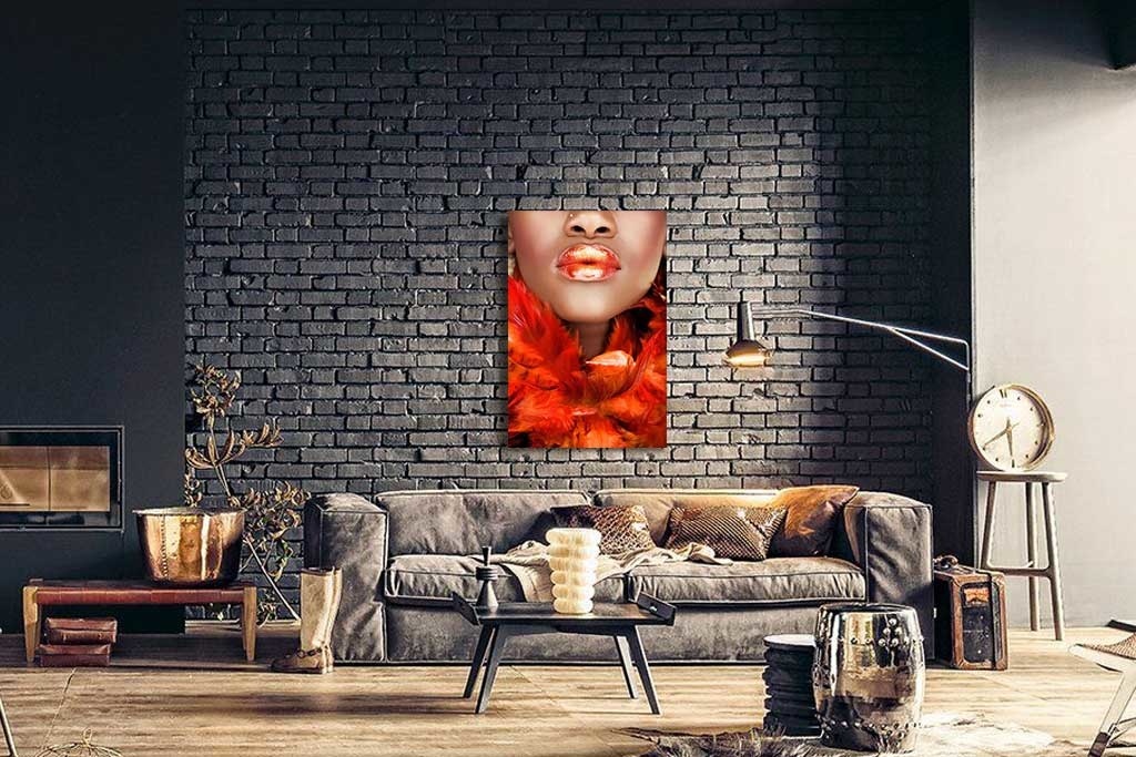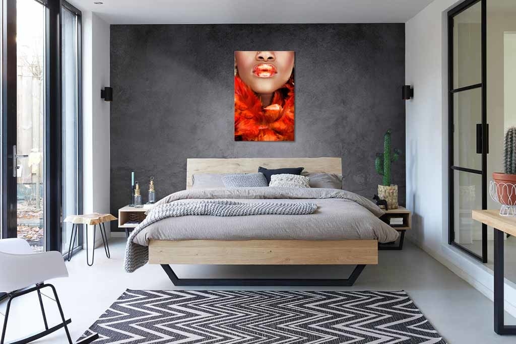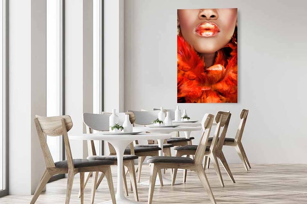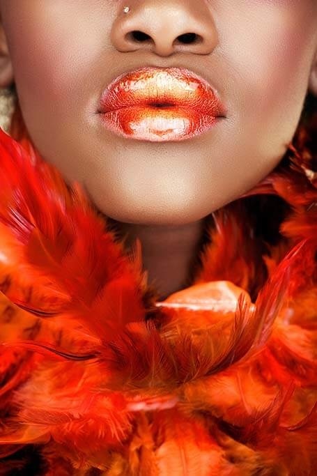 Auffällige Fotokunst einer Nahaufnahme einer Frau mit Boa. Die warme orange Farbe, die aus dem Bild heraussticht, die schönen vollen glänzenden Lippen geben dem Ganzen einen schönen Akzent.