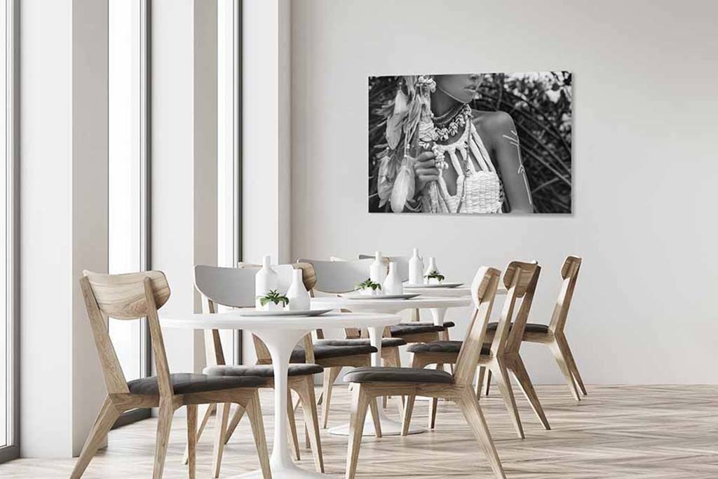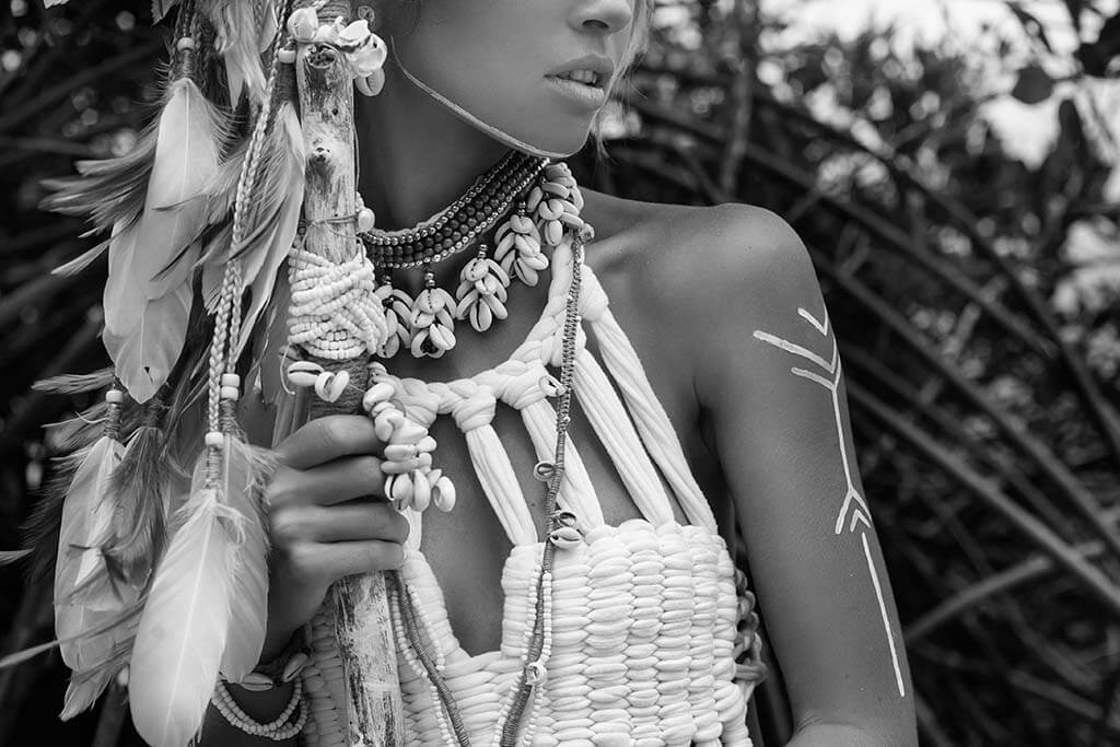 Boho Frau in schwarz und weiß dargestellt Nahaufnahme eines Teils des Körpers einer Frau in traditioneller Kleidung. Sehr schöne Ausstattung in einem kunstvollen Wohnstil.