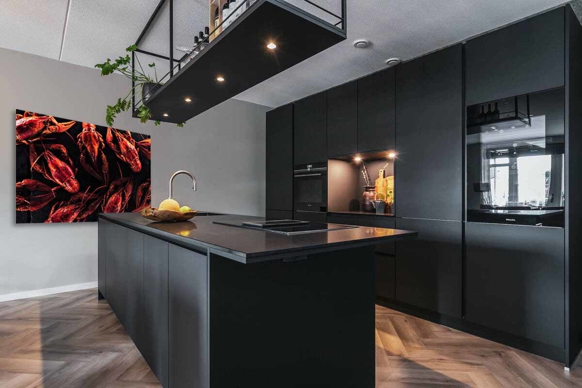 Eine Sammlung von Hummern auf einem dunklen Hintergrund. Dadurch kommt die schöne helle Farbe dieser Tiere gut zur Geltung. So ist Ihnen ein echter Blickfang sicher, der Sie immer wieder faszinieren wird. Der Hummer ist ein besonderes Tier und zeigt sich nicht im Licht. Hummer lieben die Dunkelheit. Diese Fotokunst ist die perfekte Ergänzung für Ihre Küche oder Ihr Esszimmer. Auch ein toller Einstieg in ein Restaurant! Wir können uns eigentlich keinen Raum vorstellen, in dem diese Hummer-Fotokunst nicht angebracht ist.
