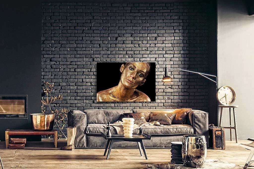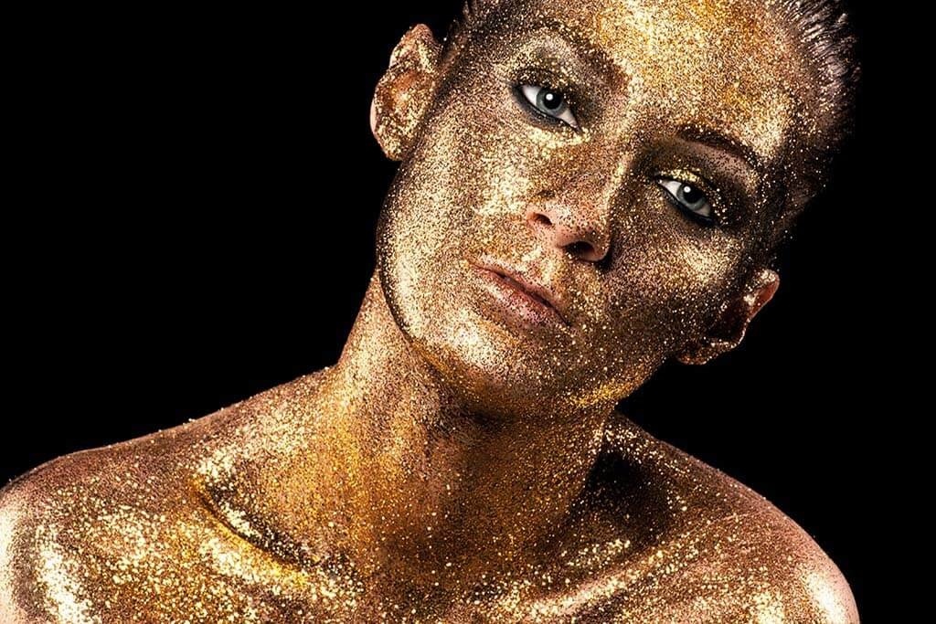 Spezielle Nahaufnahme eines Gesichts mit goldenem Glitzer. Die dargestellte Person schaut mit sprechenden blauen Augen direkt in die Kamera. Das goldene Glitzern und der schwarze Hintergrund machen das Bild zu etwas Besonderem. Hängen Sie es im Wohnzimmer auf. Schön zu kombinieren mit anderen Glitzerporträts.