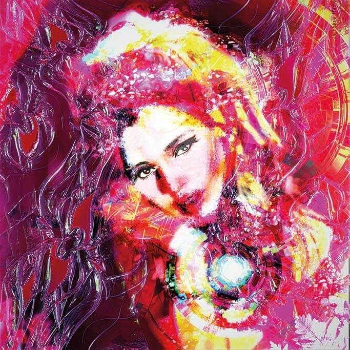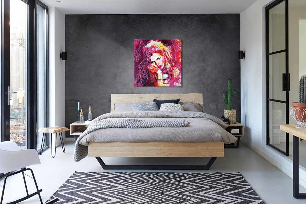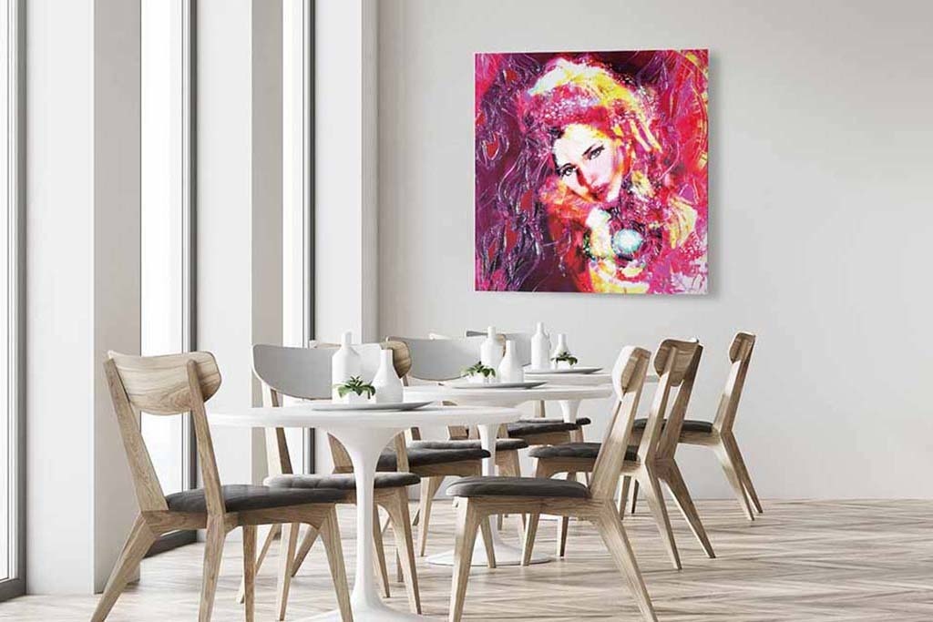 Buntes bearbeitetes Bild von Brigitte Bardot. Dem Porträtfoto wurden viele rosa und gelbe Farben und Kunstelemente hinzugefügt. Das Bild kommt direkt von der Wand. Das Bild wirkt daher sehr schön in Räumen, die etwas mehr Farbe vertragen können. Passt aber auch zu anderen Arten von Innenräumen.