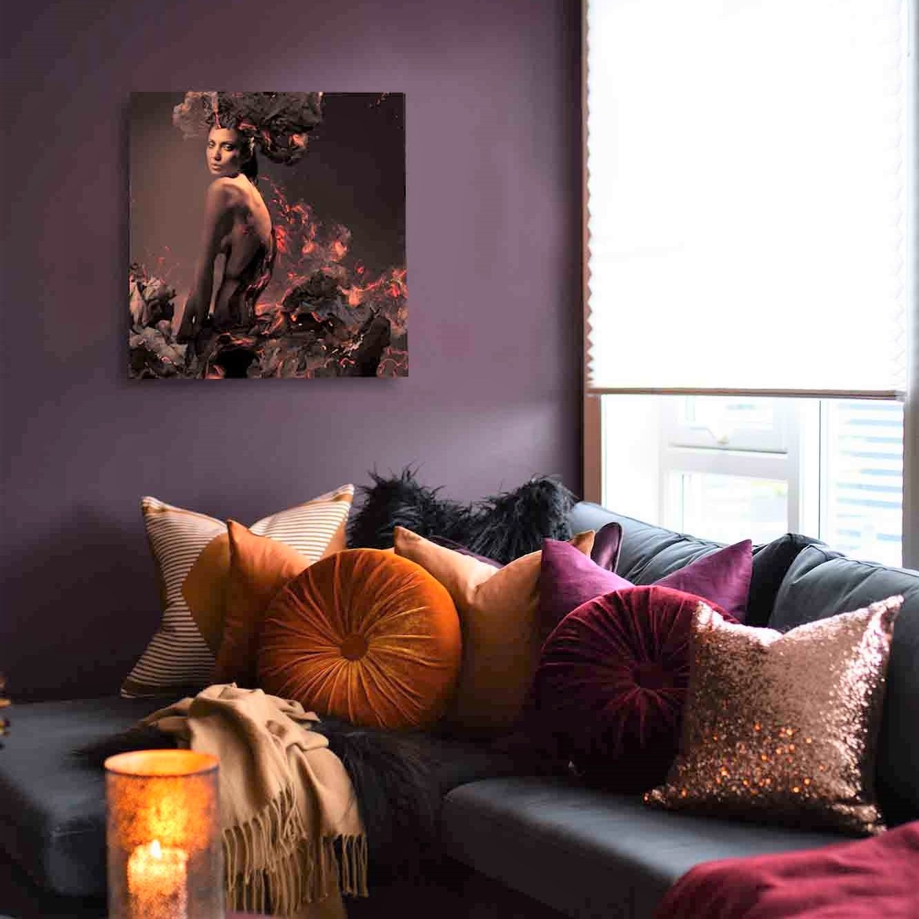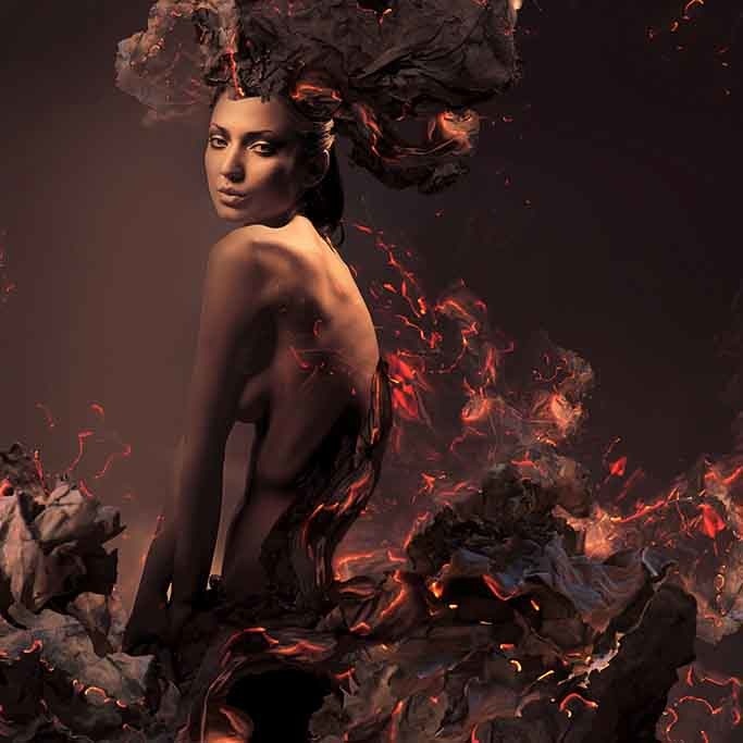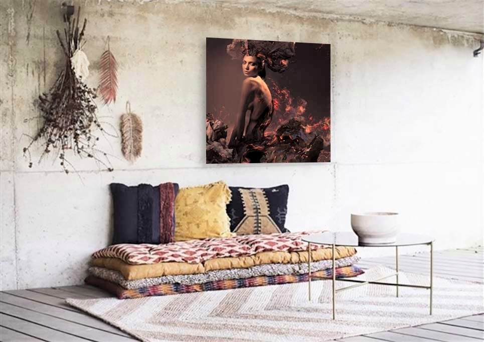 Schönes klassisches Bild einer Frau, umgeben von Papier in Flammen, schöne abstrakte Kunst in schönen tiefen Tönen.