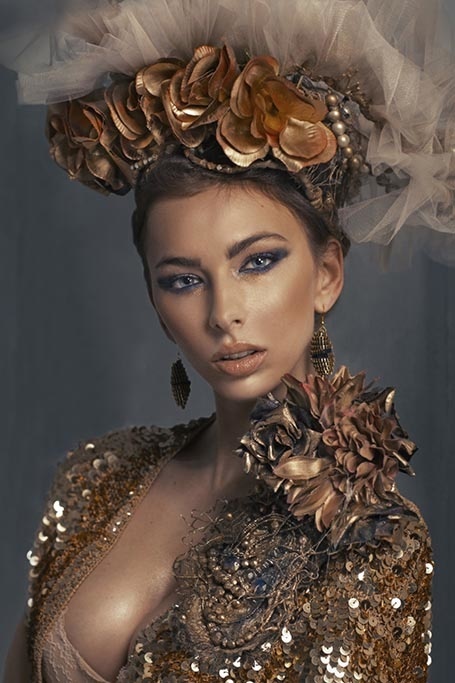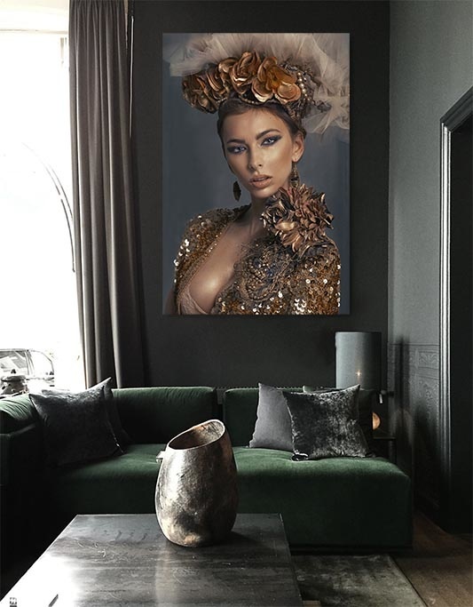 Jetzt auch im Hochformat, eines unserer meistverkauften Kunstwerke. Porträt einer schönen Frau mit speziellen Hut mit Tüll und Blumen. Die Erdtöne und der klassische Look machen diese Fotokunst zu einem besonderen Bild. Passt gut in einen ruhigen Innenraum, wo dieses Bild auffallend schön sein wird