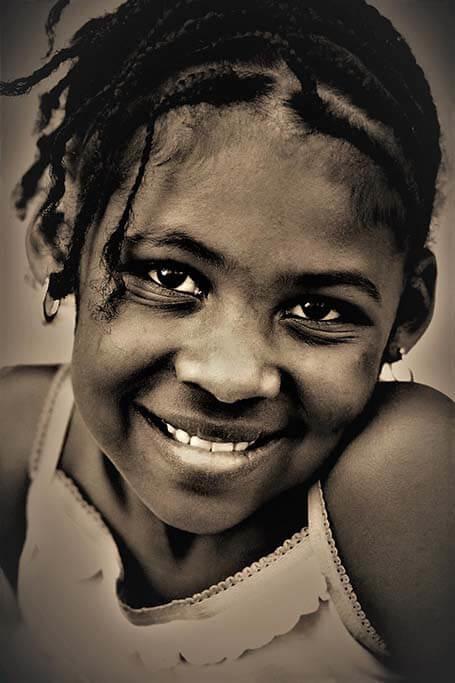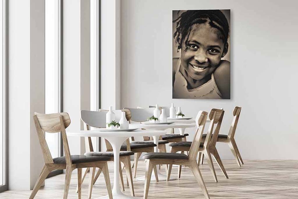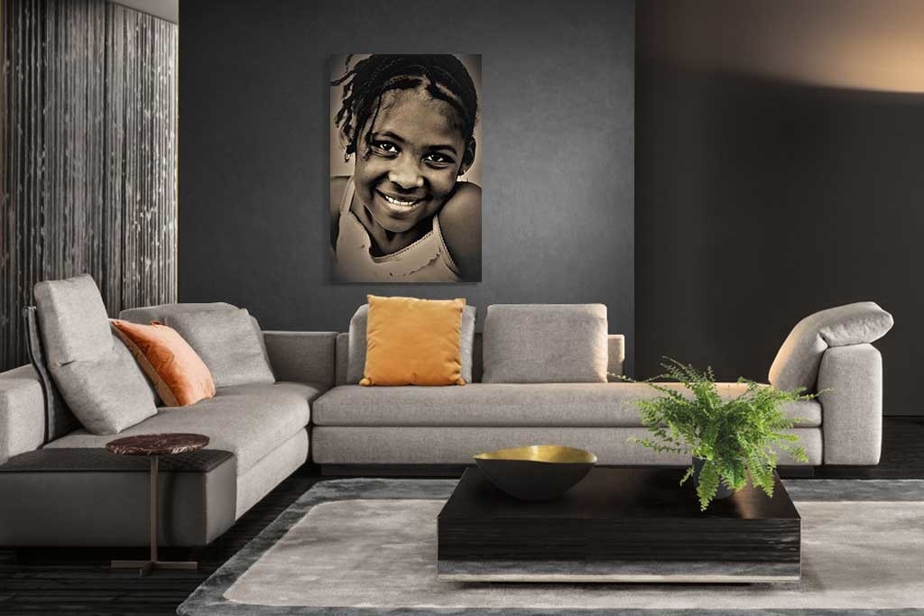 Sepia-Bild eines lächelnden Kindes. Das Mädchen schaut strahlend in die Kamera, was das Bild direkt ansprechend macht. Durch den Sepia-Effekt des Bildes bekommt das Bild sofort eine zusätzliche Atmosphäre. Schön zu kombinieren mit anderen Fotoporträts in dieser Farbe. Sieht sowohl im Wohnzimmer als auch in anderen Räumen schön aus.