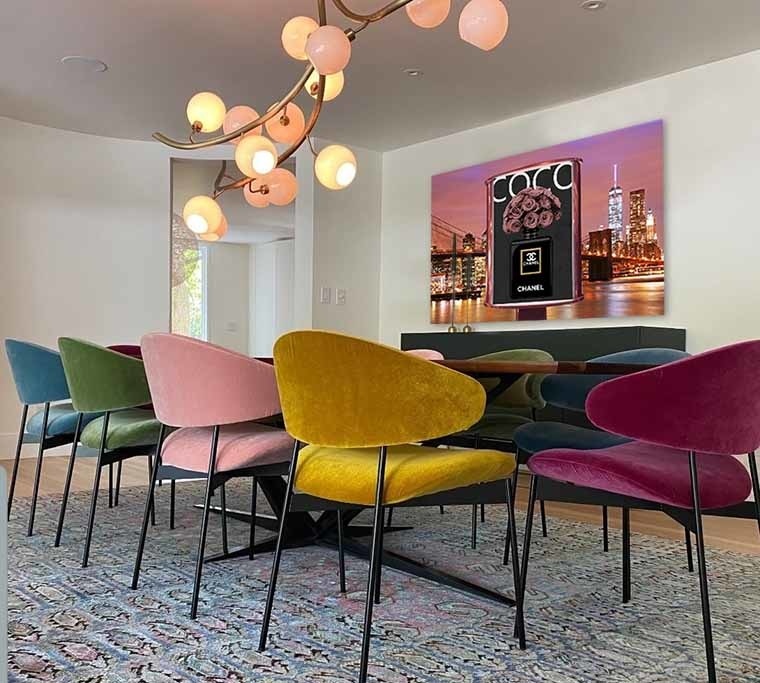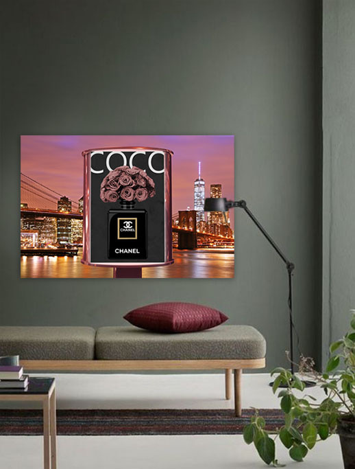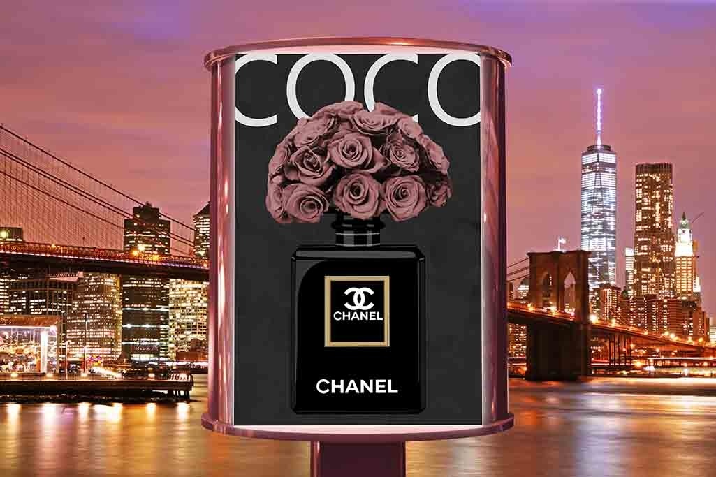 Coco Chanel ist natürlich eine immerwährende Quelle der Inspiration; die Essenz der Weiblichkeit. Diese Fotokunst zeigt den ikonischen Parfümflakon. Mythisch und zeitlos dank der minimalistischen Linien und luxuriös dank der schönen Rosen mit tiefrosa Farbe. Die Werbetafel ist in der Stadt, die niemals schläft, abgebildet: The Big Apple, New York.