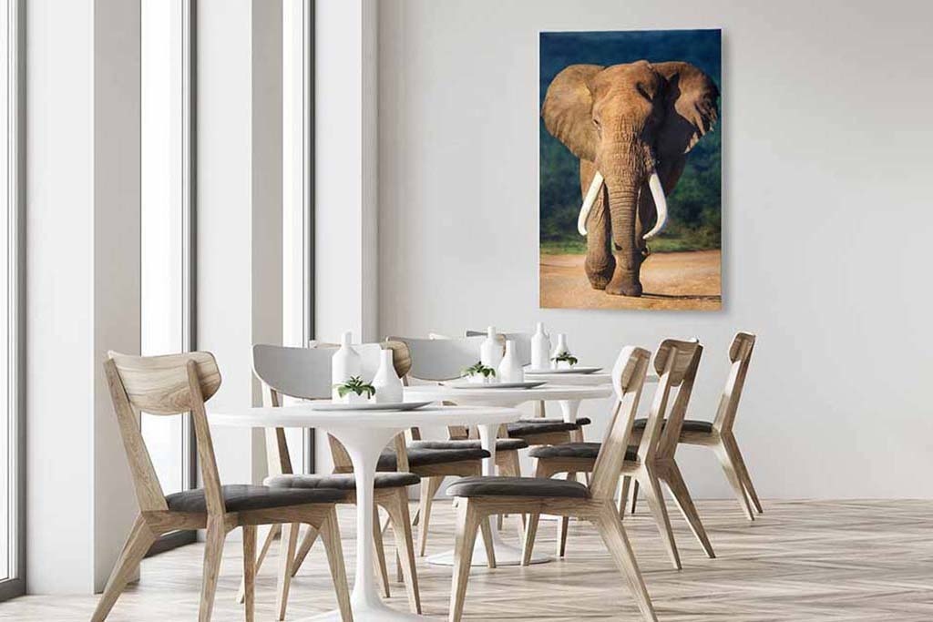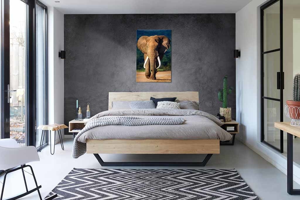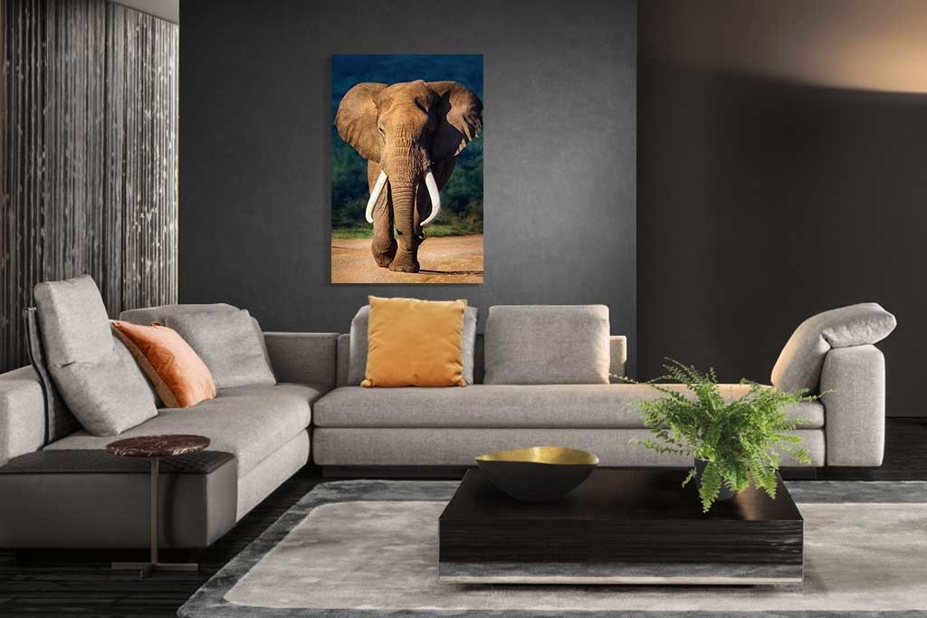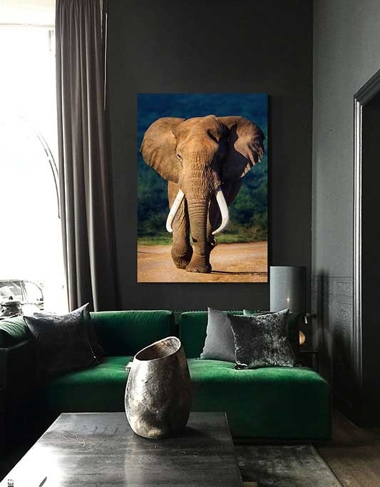 Elefant in schönen tiefen Farben gedruckt, groß und eindrucksvoll ein Bild, das immer wieder die Aufmerksamkeit auf sich zieht und im Großformat am besten zur Geltung kommt.