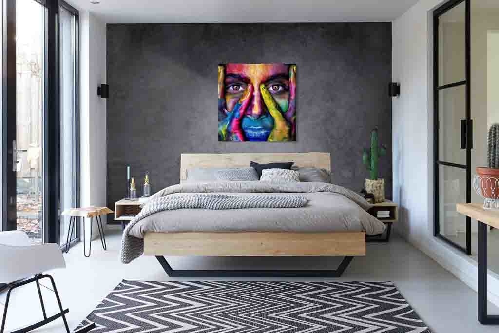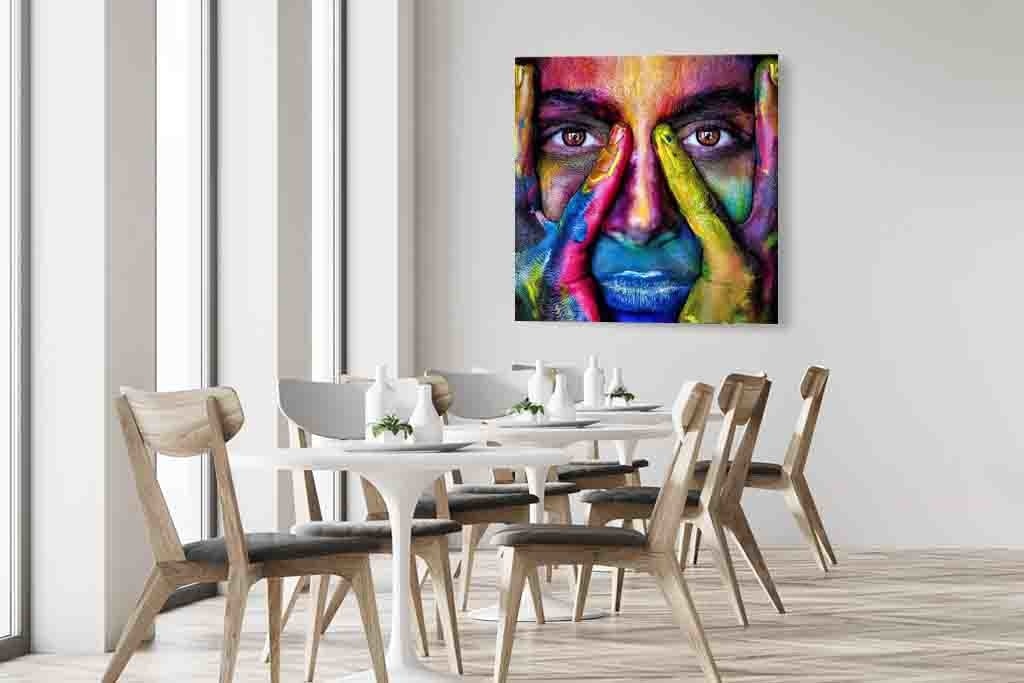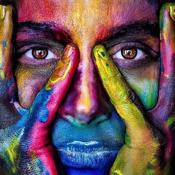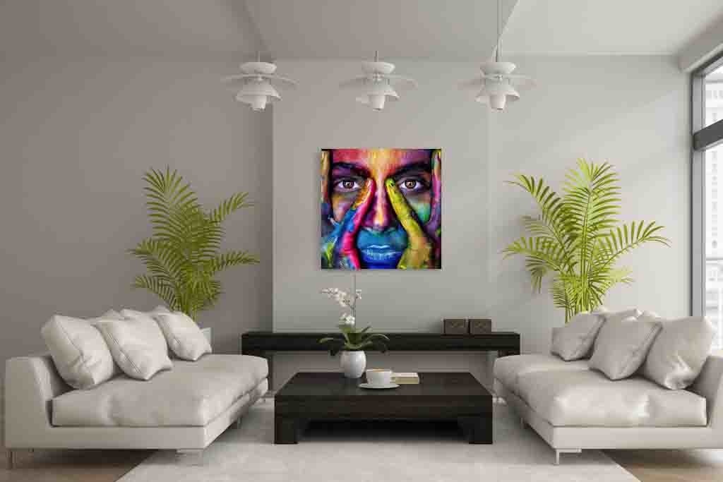 Frau mit bemaltem Gesicht und Händen, die dieses Bild zu einem bunten Ganzen machen. Schöne Kunst für die Wand an einem Ort, der etwas Fröhlichkeit gebrauchen könnte.