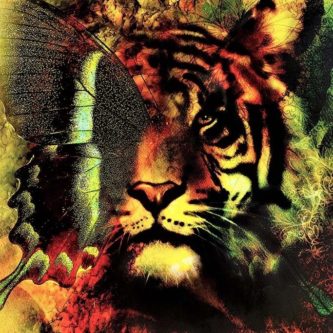 Ungewöhnliche bunte Abbildung eines Tigers. Dem Bild wurde eine Reihe von künstlerischen Elementen hinzugefügt. Wie ein Flügel eines Schmetterlings und alle Arten von Farben. Es springt direkt von der Wand, wenn Sie es zum Beispiel im Wohn- oder Schlafzimmer aufhängen. Sieht aber auch in anderen Räumen gut aus.