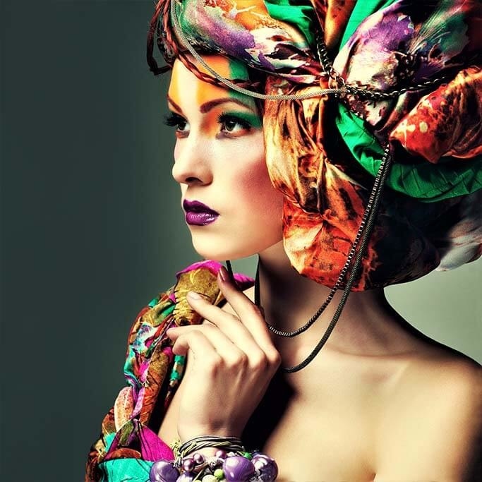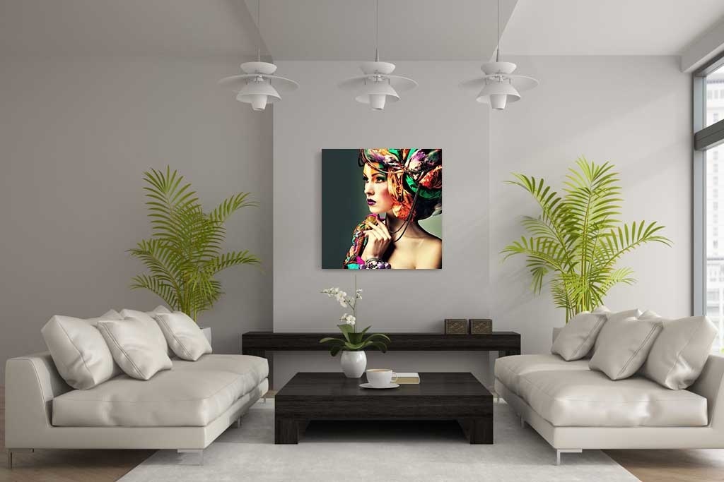 Ein farbenfrohes Bild, das direkt von der Wand springt. Die Frau auf dem Bild trägt Accessoires in allen Farben des Regenbogens, ihr Make-up ist darauf abgestimmt. Geeignet für alle, die mehr Farbe in den Innenraum bringen wollen. Passt zu vielen verschiedenen Wohnstilen.