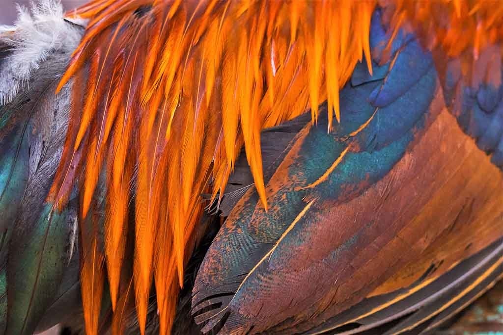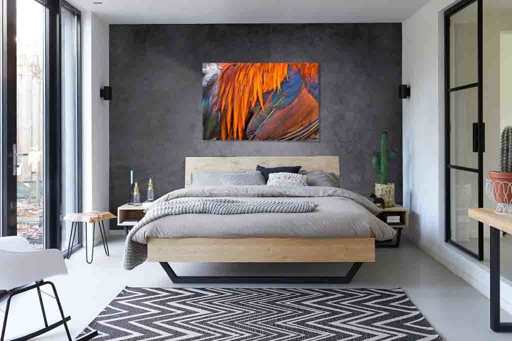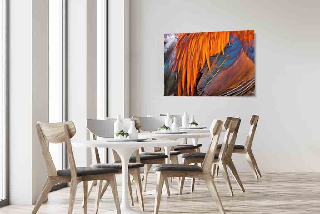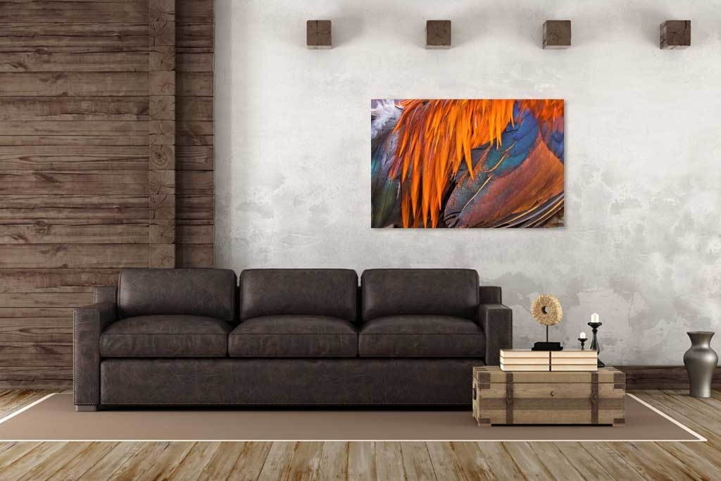 Wunderschönes abstraktes Bild von bunten Federn, brillante Farbkombination machen dieses Fotokunstwerk zu etwas Besonderem und wird sicherlich die Aufmerksamkeit auf sich ziehen.