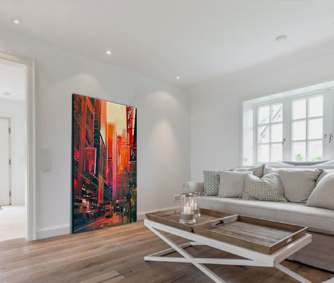 Die Fototafel hat rundum ein luxuriöses Aluminiumprofil auf der Rückseite und kann mit einem Schraubendaumen (Haken) an die Wand gehängt werden. Das hintere Profil sorgt für Stabilität und verhindert ein Verziehen der Verkleidung. Da das Profil 2 Zentimeter dick ist, wird ein schwebender Effekt Ihres Kunstwerks an der Wand erzeugt.
