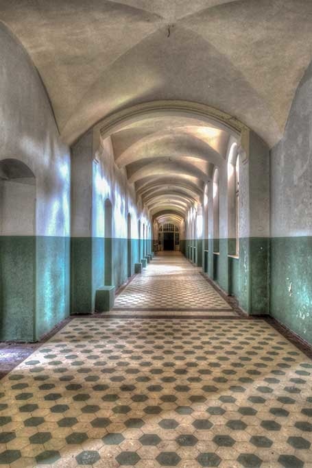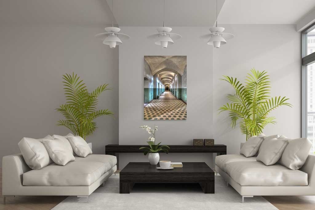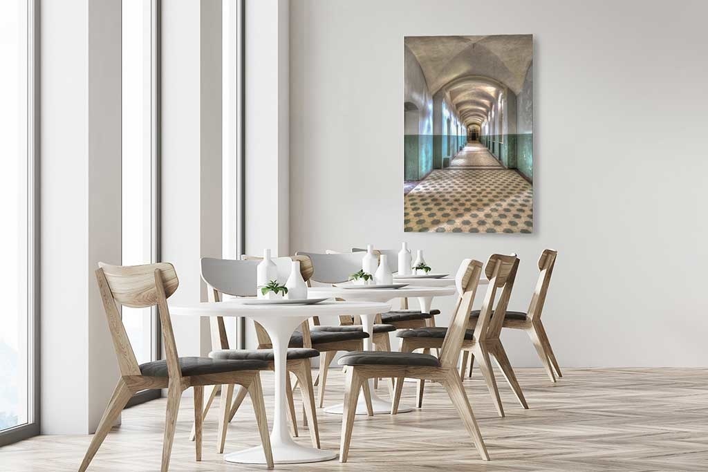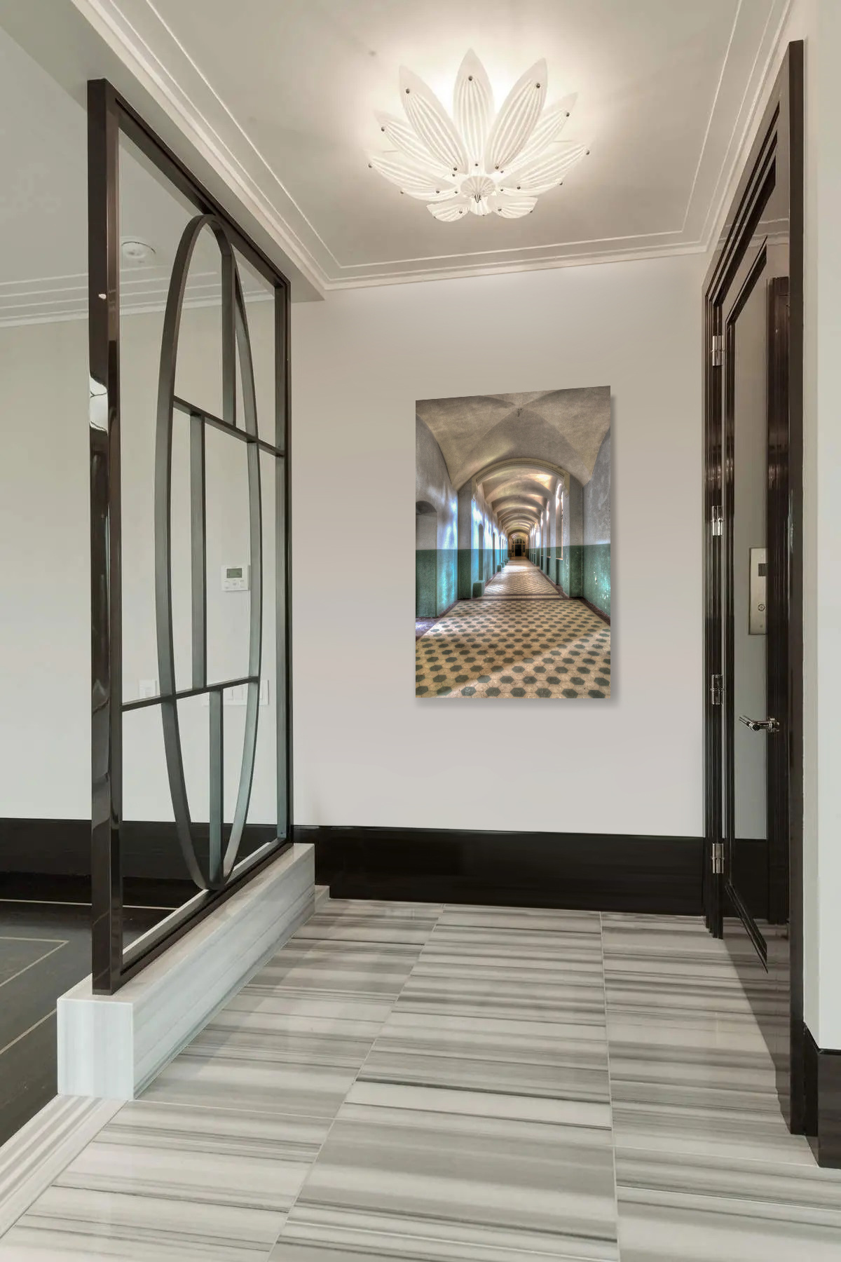 Fotokunst von einer Halle eines alten Gebäudes. Schöne Schattierungen und Tiefenwirkung machen dieses Bild zu etwas Besonderem.