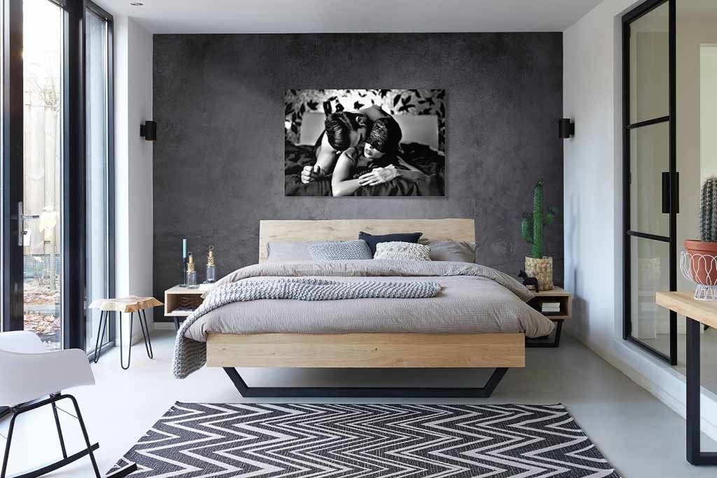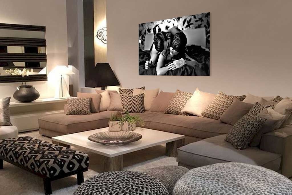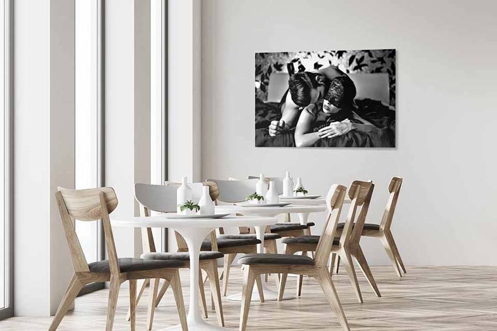 Aufregendes Bild eines Paares im Bett. Der Mann liegt auf der Frau und küsst sie in den Nacken. Der Schwarz-Weiß-Effekt verleiht dem Bild eine besonders spannende Note. Passt natürlich sehr gut an die Wand im Schlafzimmer. Passt zu vielen Wohnstilen.