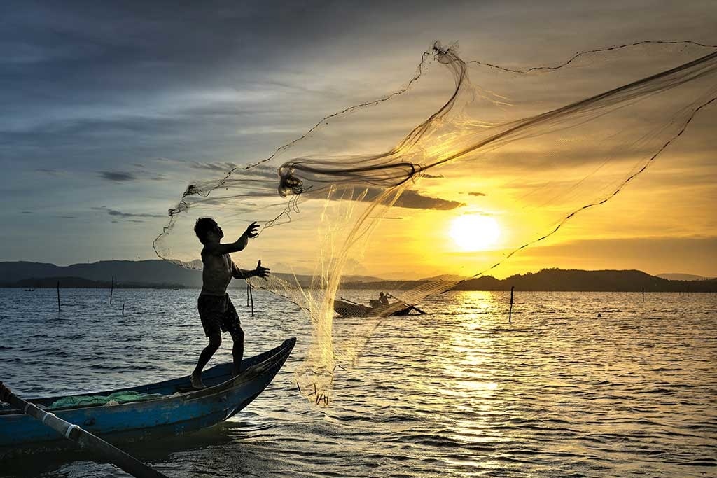 Prächtiges Bild eines Fischers in Vietnam, der bei Sonnenaufgang seine Netze auswirft.