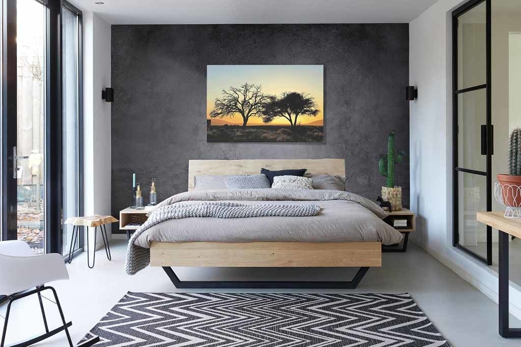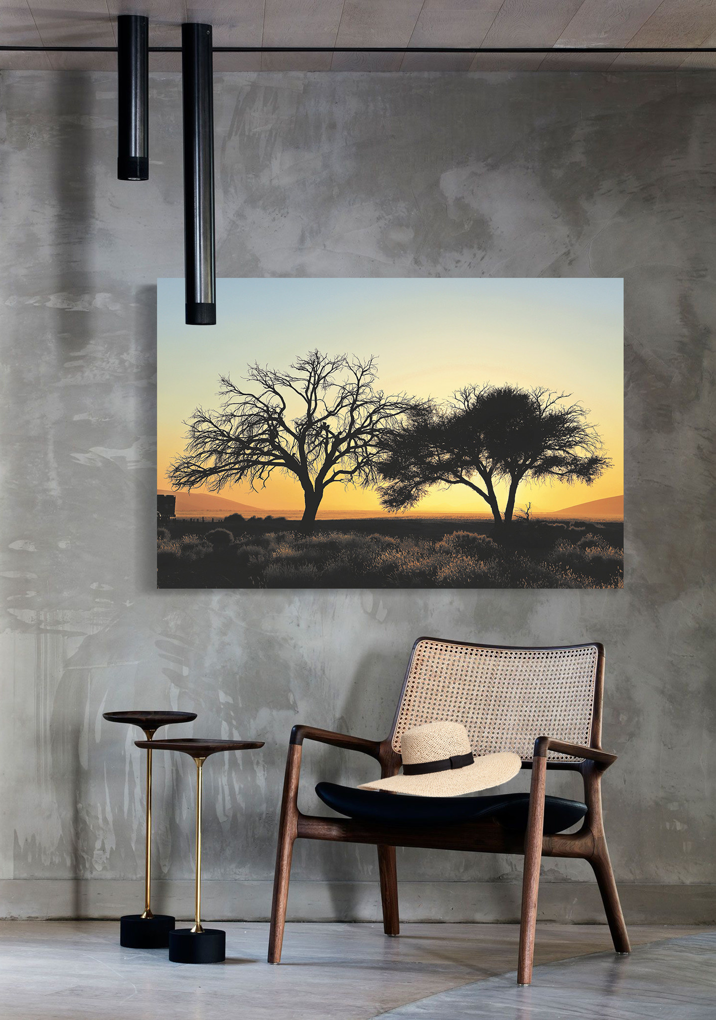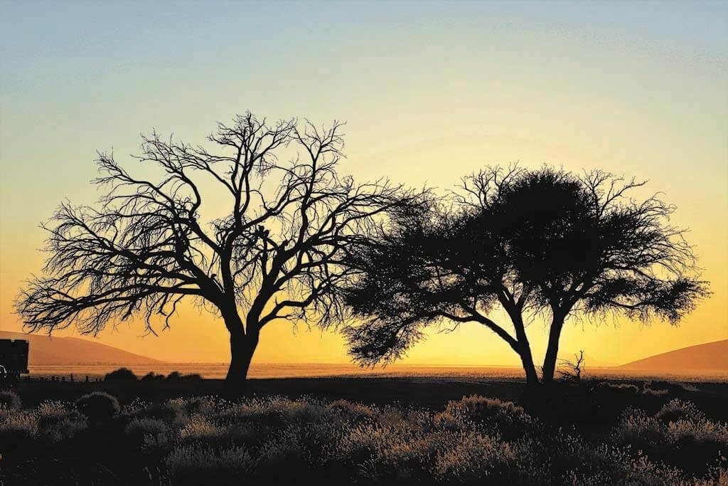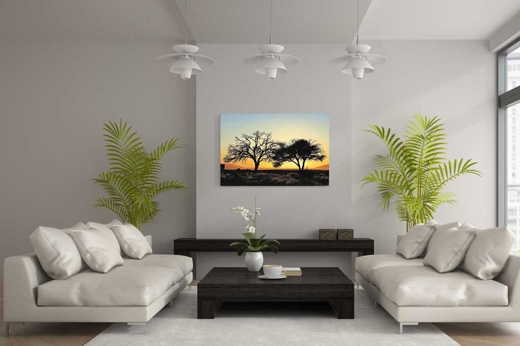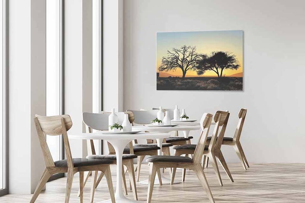 Bild von zwei Bäumen in der Wüste bei Sonnenuntergang. Die dunklen Silhouetten der Bäume kontrastieren gut mit dem orangefarbenen Himmel. Dies verleiht dem Ganzen einen romantischen Charakter. Das Bild ist sehr geeignet für Naturliebhaber und Weltreisende. Sieht in jedem Raum des Hauses gut aus.