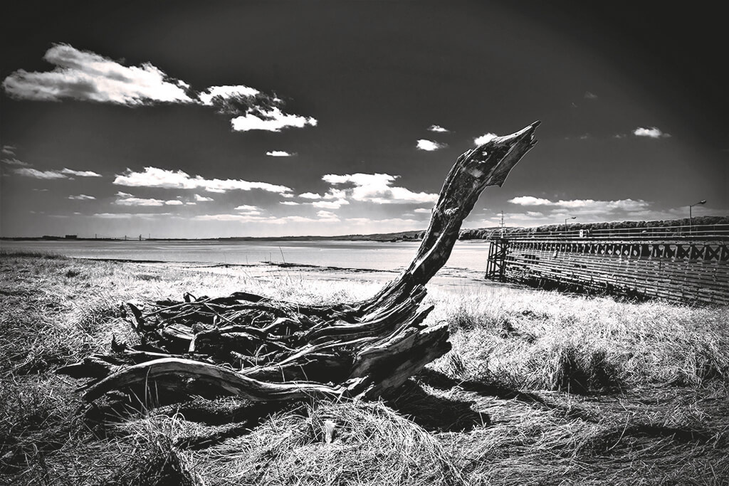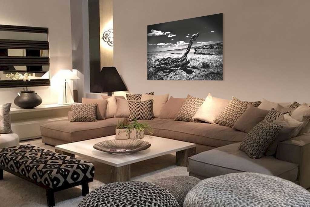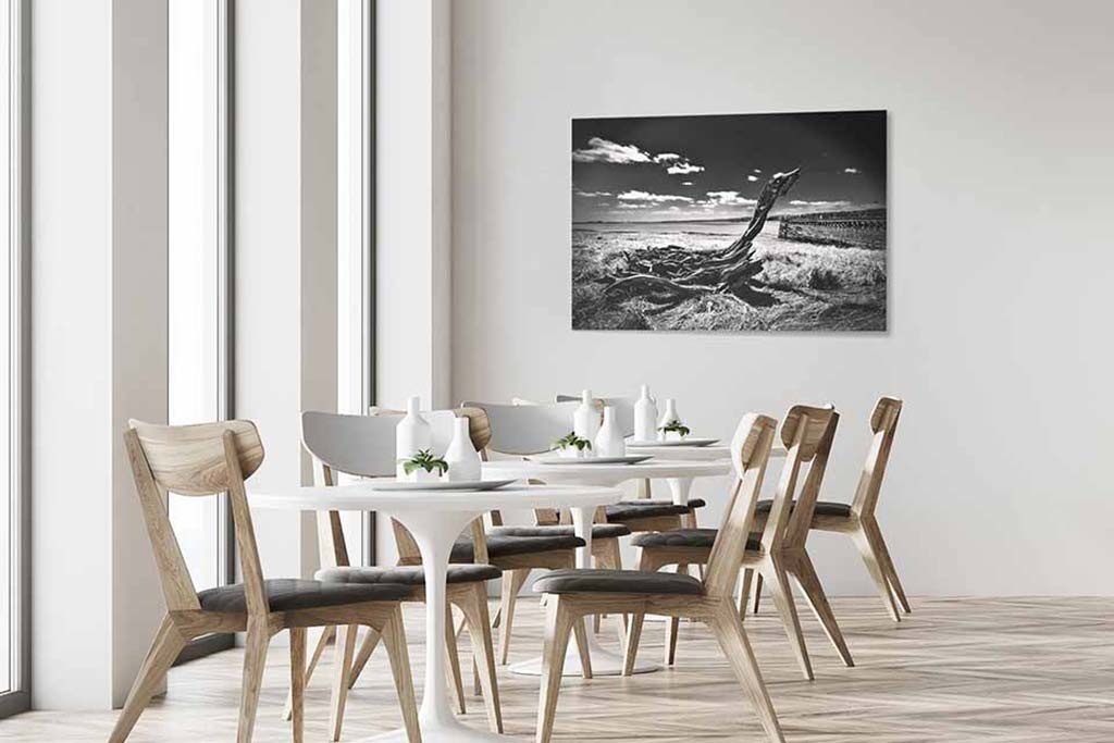 Spezielles Schwarz-Weiß-Bild einer Küstenlandschaft. Ein Stück Treibholz liegt am Strand mit Wasser und klarer Luft im Hintergrund. Der Schwarz-Weiß-Effekt verleiht dem Bild ein charakteristisches Aussehen. Sieht in jedem Raum des Hauses und zum Beispiel in einem Arbeitsbereich gut aus. Passt zu jedem Wohnstil.