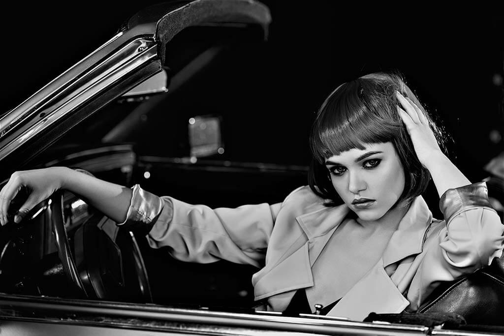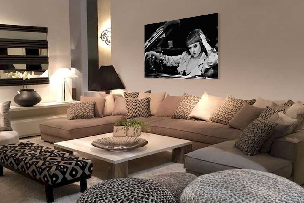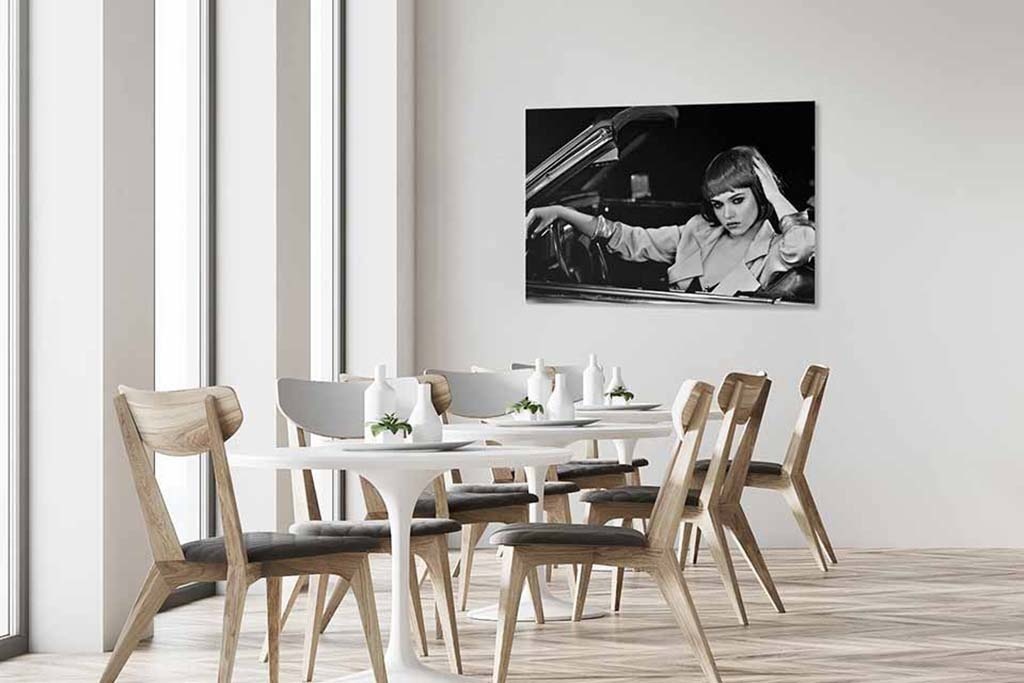 Frau sitzt in einem Auto. Die junge Frau lehnt sich an den Autositz und blickt direkt in die Kamera. Der Schwarz-Weiß-Effekt macht das Bild besonders kraftvoll. Lässt sich gut mit anderen Schwarz-Weiß-Porträts kombinieren. Ist sowohl über dem Sofa, Bett oder Küchentisch schön.