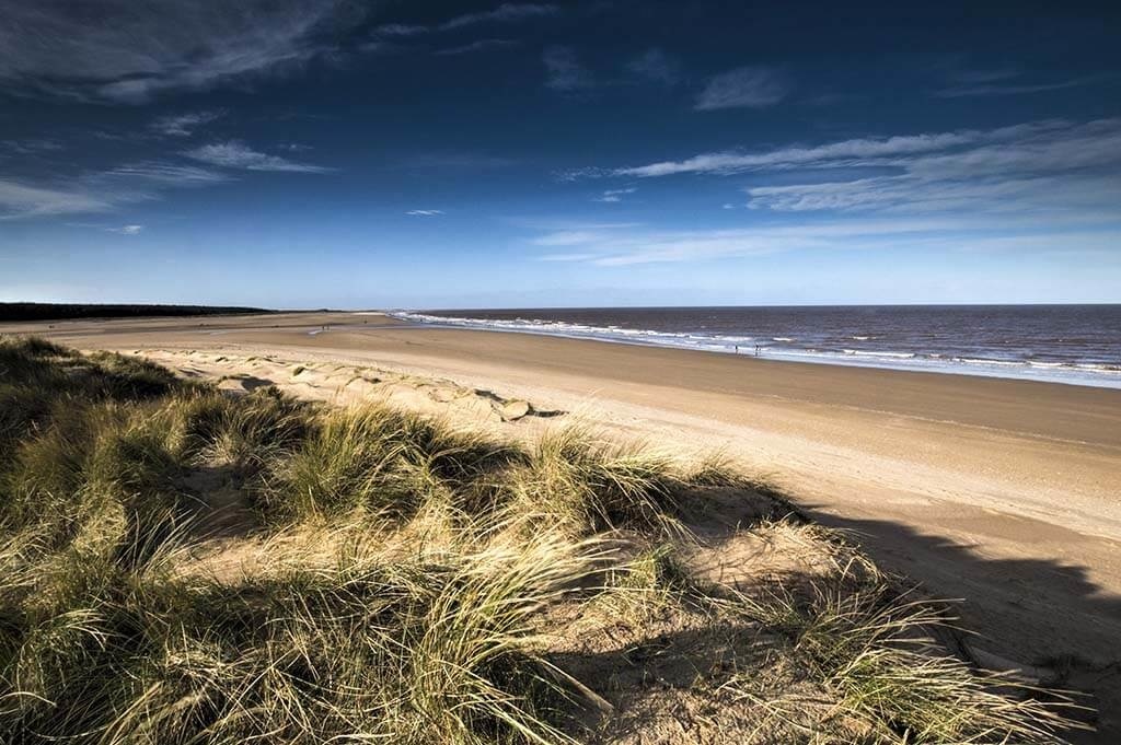Ein klassisches Landschaftsfoto von Dünen. Das Bild zeigt einen schönen blauen Himmel, einen fast menschenleeren Strand und wogendes Dünengras. Träumen Sie bei diesem Bild vor sich hin und fühlen Sie sich wie am Strand. Schön zu kombinieren mit anderen Bildern von Dünen oder Sandstränden.