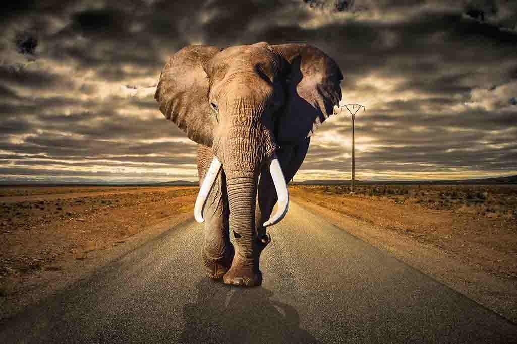 Surrealistisches Bild von einem Elefanten auf der Straße mit der schönen Dämmerung und Wolken im Hintergrund. Speziell für Xiart hergestellt.