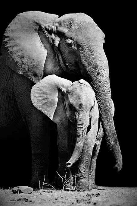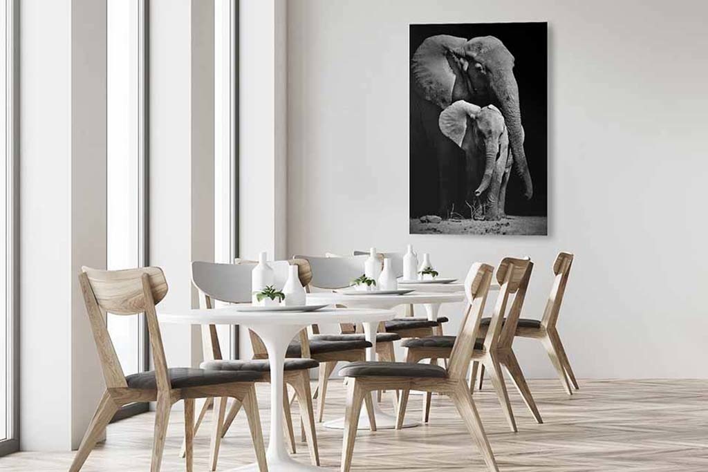 Ein Schwarz-Weiß-Foto von einem Elefanten mit Nachwuchs. Der kleine Elefant steht dicht bei seiner Mutter. Das macht es zu einem besonderen Bild. Der schwarze Hintergrund unterstreicht die natürliche Schönheit. Passt in jeden Innenraum. Hängen Sie das Bild zum Beispiel an die Wand im Schlafzimmer.