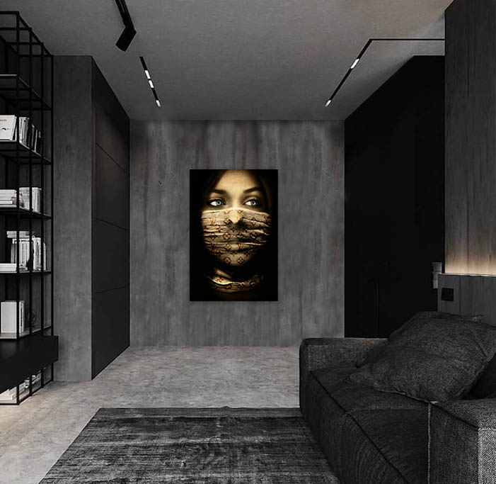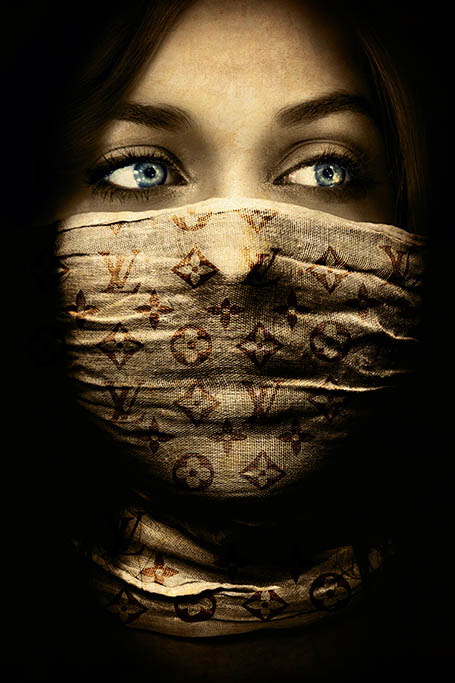 Gutaussehende Frau mit schönen markanten Augen und modischem Mundschutz im Louis Vuitton-Stil. Sobald Sie den Raum betreten, in dem dieses Kunstwerk an der Wand hängt, wird es sofort die Aufmerksamkeit auf sich ziehen.