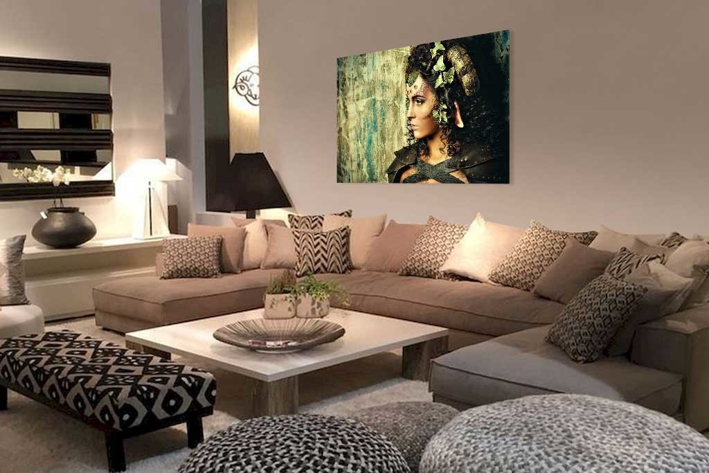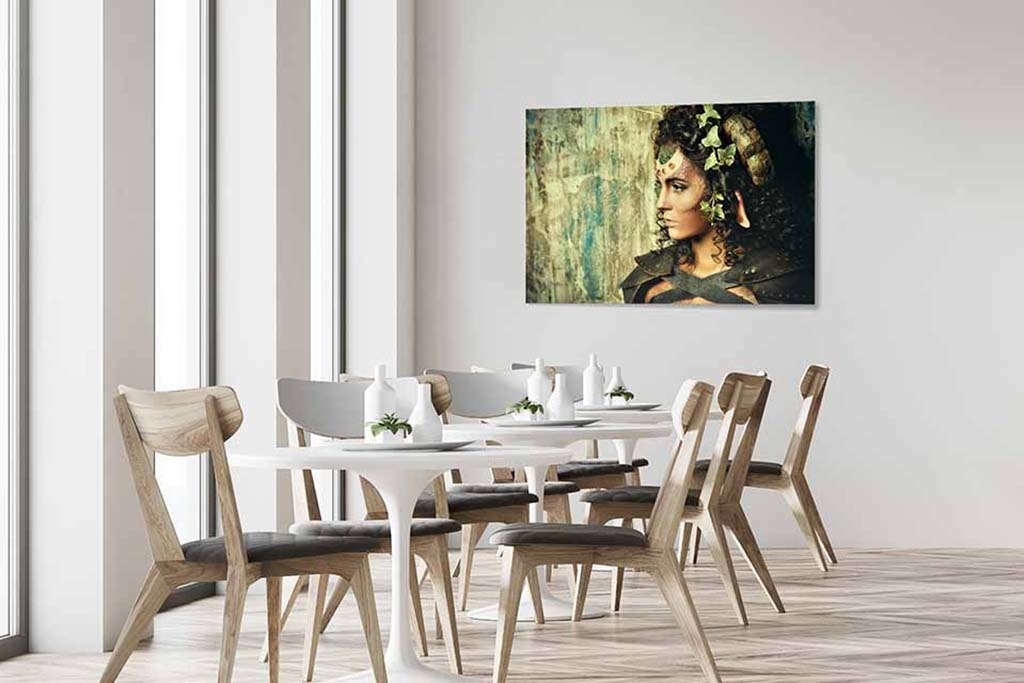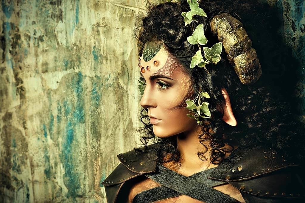 Diese Frau ist einem Märchen entsprungen. Durch ihre Hörner, Ohren, Schminke und ihr Outfit sieht sie aus wie eine Figur aus einer mythischen Geschichte. Kombinieren Sie mit anderen Bildern von mythischen Figuren und kreieren Sie Ihre eigene Serie. Hängen Sie sie im Wohn- oder Schlafzimmer auf.