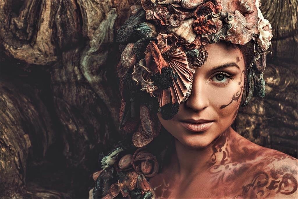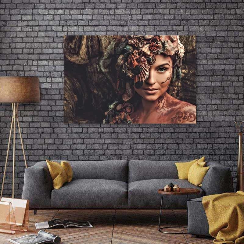 Besonderes Porträt einer Fantasiefigur. Die Hälfte der Frau ist mit bunten Elementen bedeckt, auf ihrem Körper befinden sich auch Figuren. Geeignet für alle, die ein märchenhaftes Bild lieben. Ist zum Beispiel sehr gut im Schlafzimmer. Passt in fast jeden Innenraum.