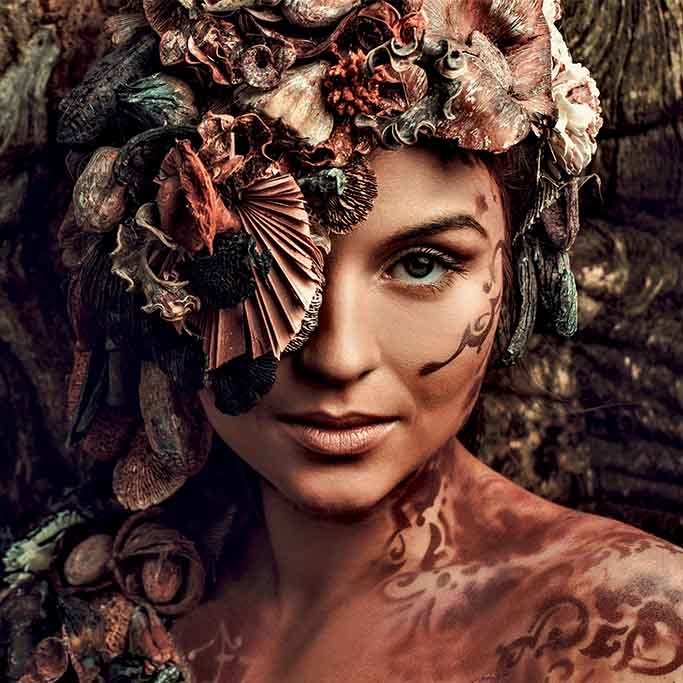 Schönes klassisches Bild in schönen Schattierungen einer modernen Frau mit Tattoos auf der Schulter. schöne Mischung aus klassischem Bild in der heutigen Zeit.