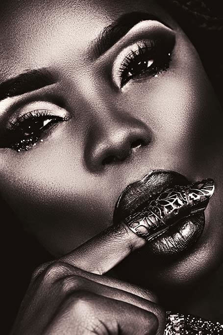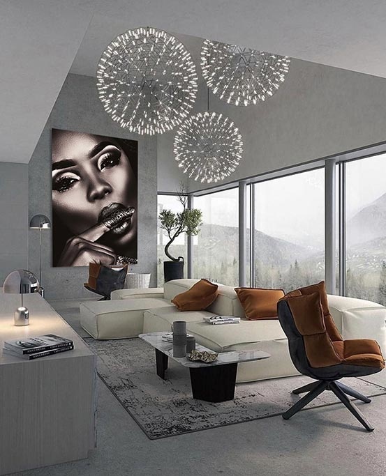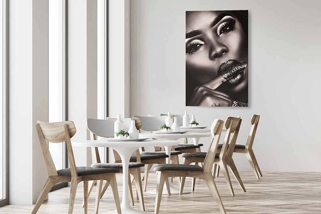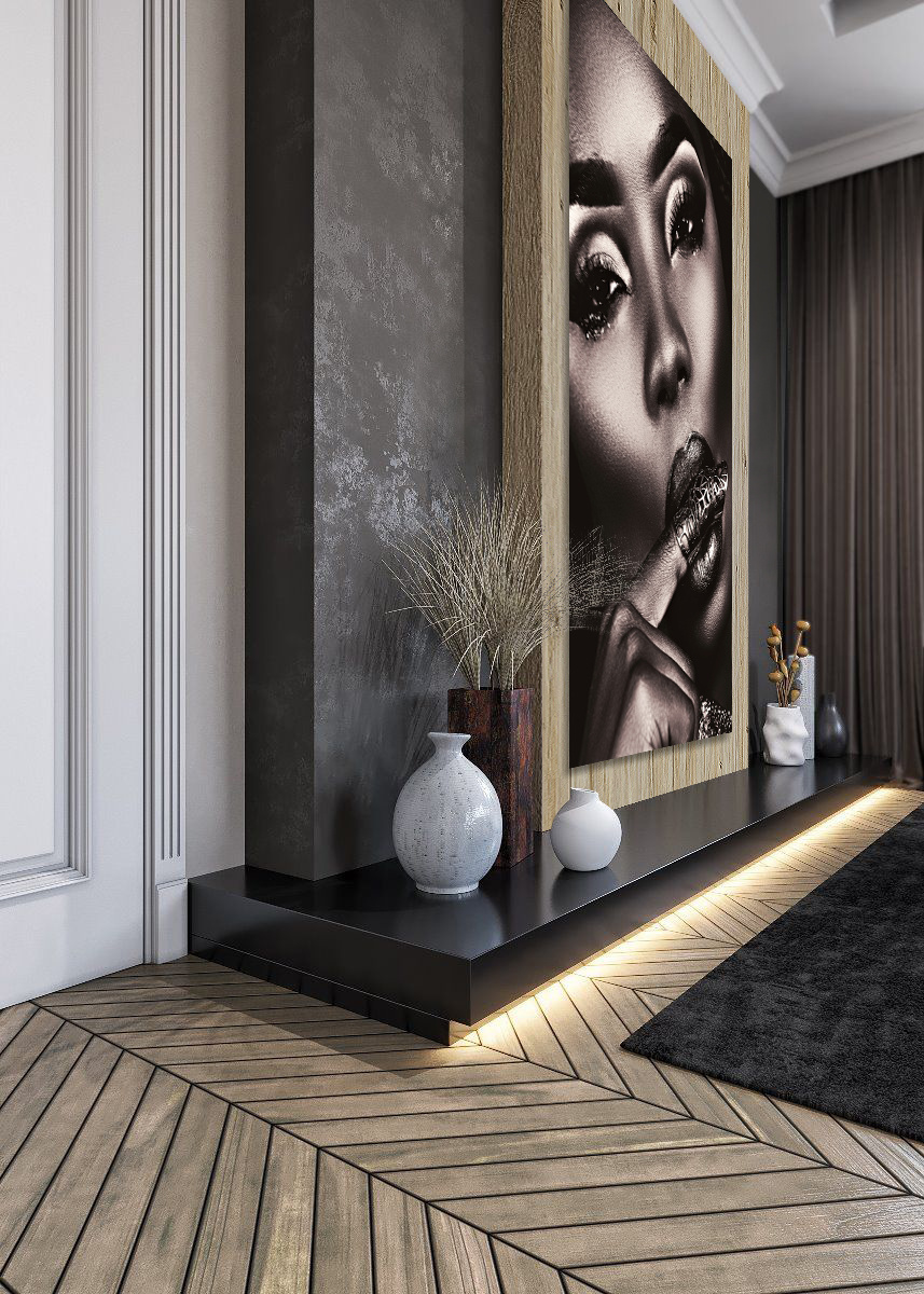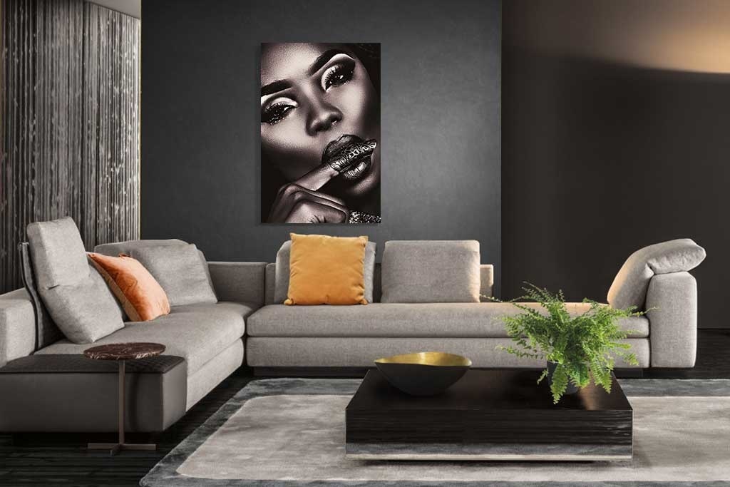 Spezielle Nahaufnahme einer Frau. Es gibt eine Art Schwarz-Weiß-Effekt mit Brauntönen über dem Bild. Das bringt die Schönheit der Frau gut zur Geltung. Kombinieren Sie mit anderen Nahaufnahmen, um Ihre eigene Serie zu erstellen. Passt zu fast jedem Wohnstil.