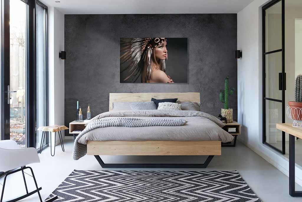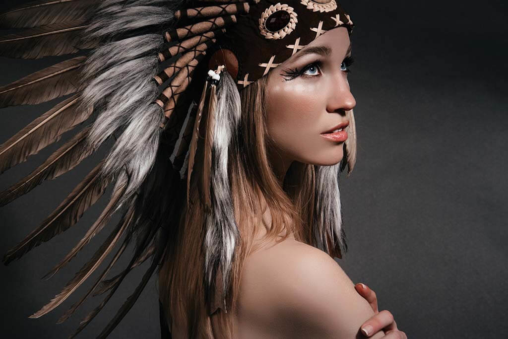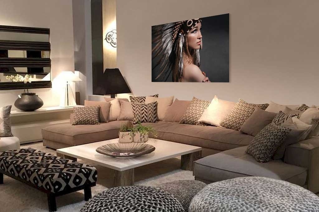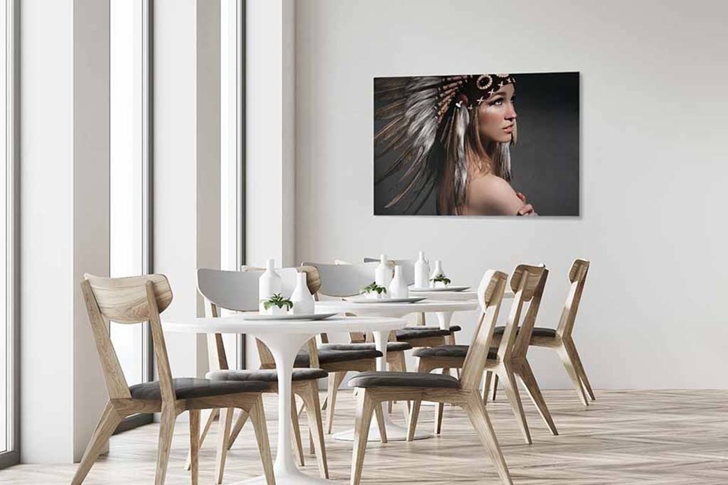 Porträt einer Frau mit Indianerkopfputz. Die Frau trägt außer dem Ornament nichts und das macht es zu einem reinen Bild. Die schöne Verwendung von Farbe rundet die Komposition ab. Sehr gut geeignet für Liebhaber der besonderen Porträtfotografie. Sieht gut aus, zum Beispiel im Wohnzimmer, Schlafzimmer oder Büro.