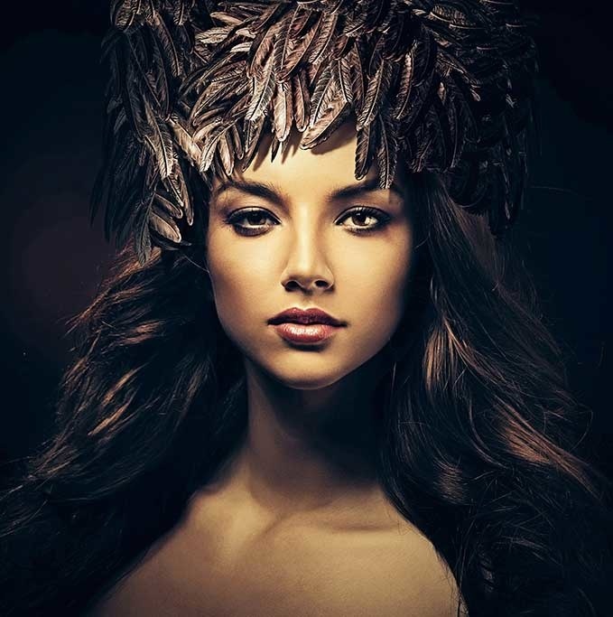 Schönes Bild einer exotischen Frau mit gefiedertem Hut in schönen dunklen Farbtönen.