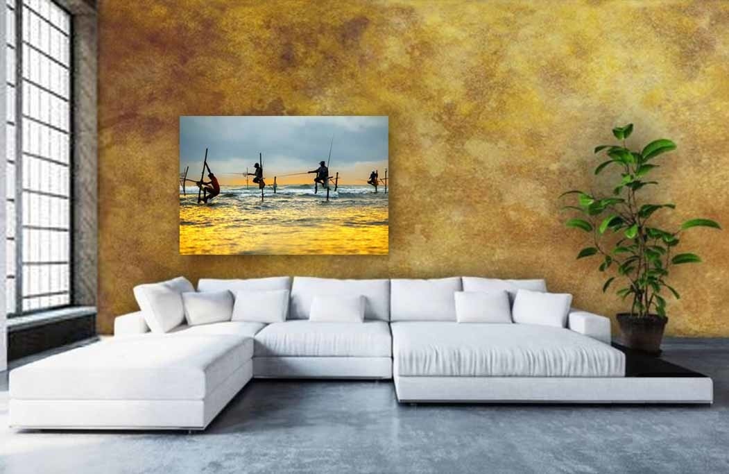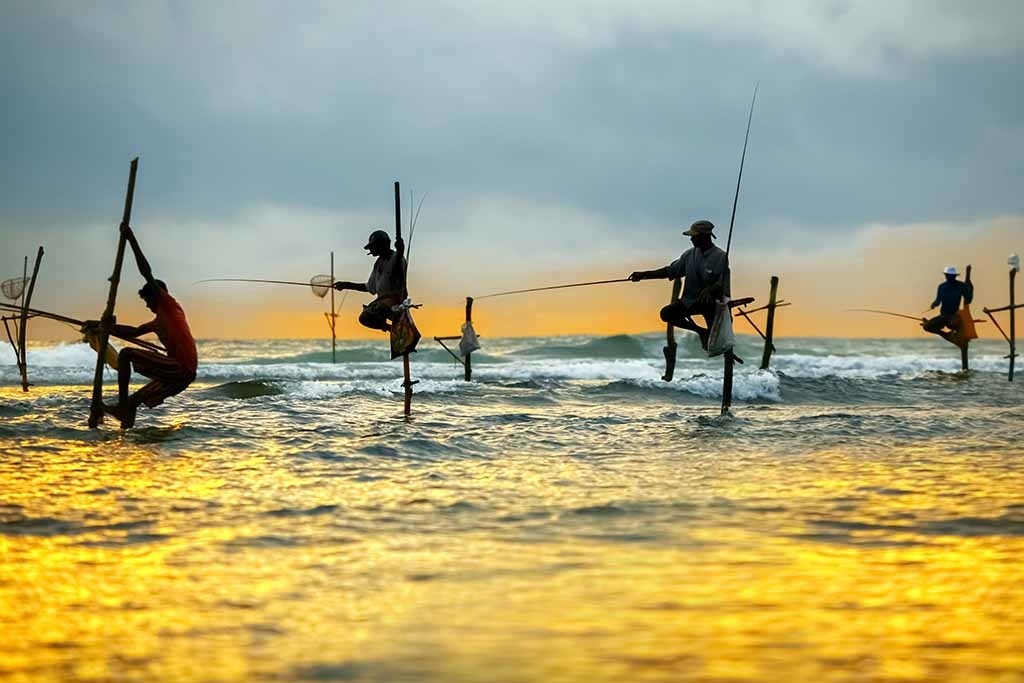 Schönes kulturelles Bild von Fischern auf dem Meer im goldenen Meeresglühen, die auf traditionelle Weise fischen, wie es auch heute noch in Sri Lanka gemacht wird.