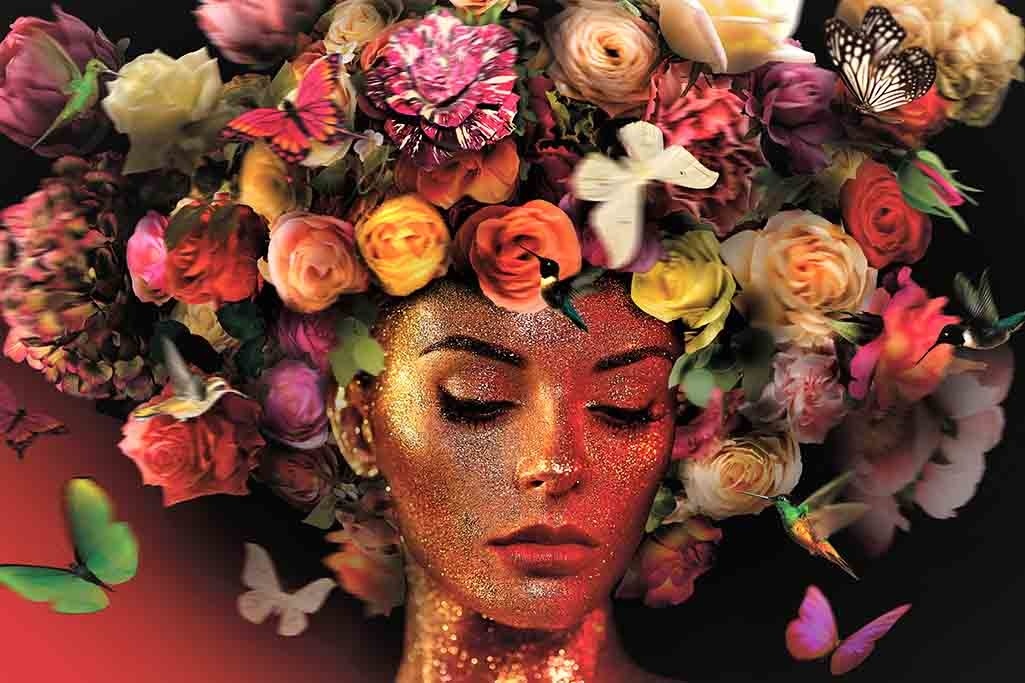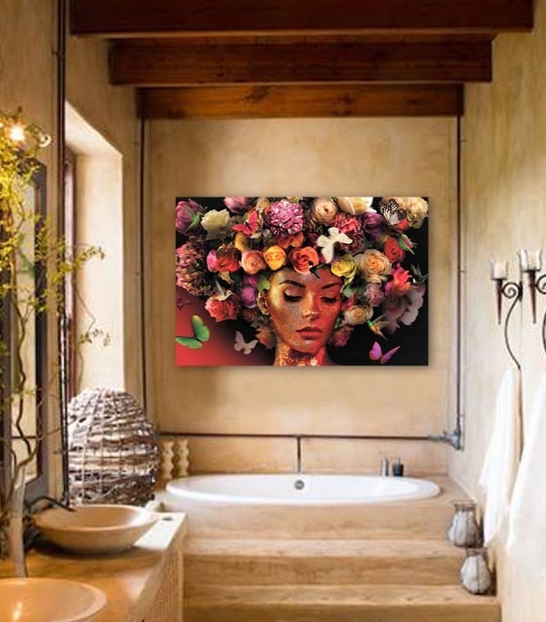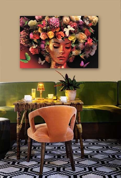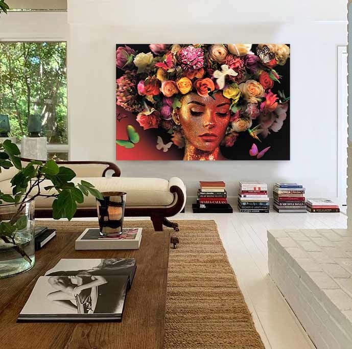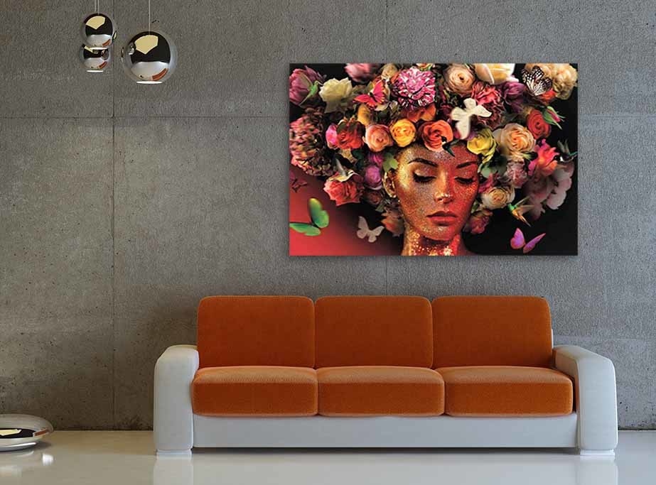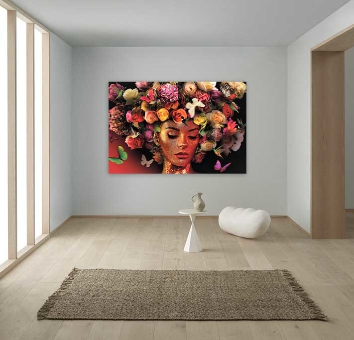 Wunderschönes buntes Bild einer attraktiven Frau mit Blumen auf dem Kopf. Ein echter Blickfang, der sofort alle Blicke auf sich zieht. Speziell für Xiart hergestellt, erhältlich in limitierter Auflage mit Echtheitszertifikat.