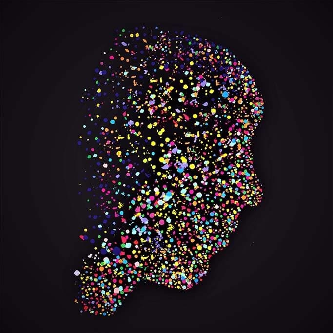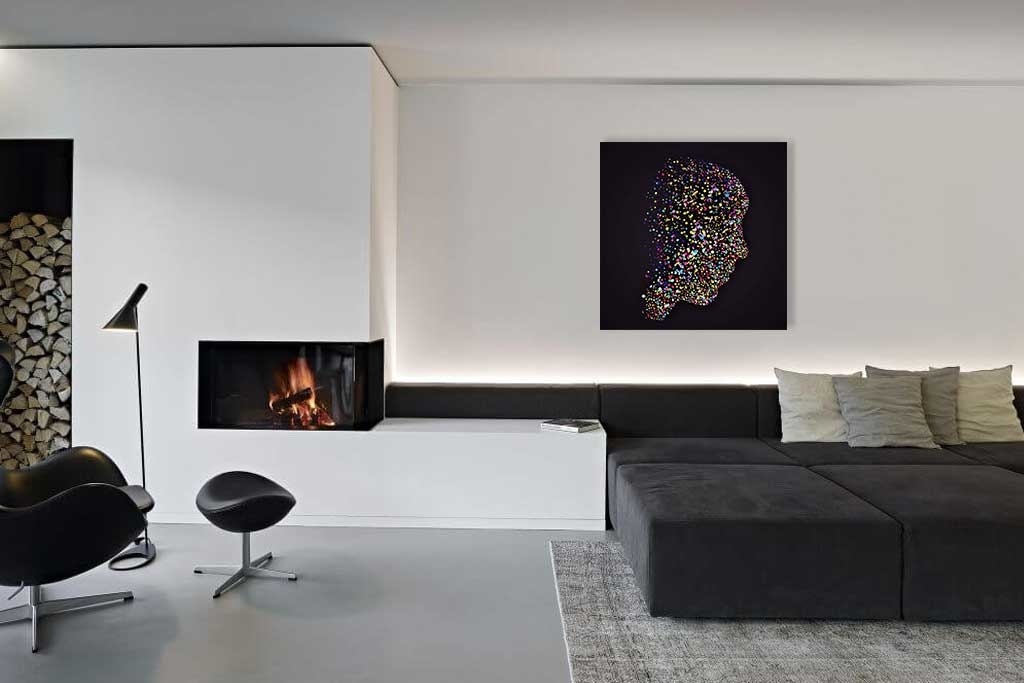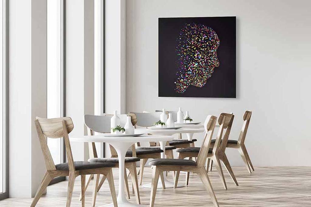 Ein farbenfrohes abstraktes Bild, das einen Kopf zeigt. Die farbigen Punkte bilden zusammen einen Kopf im Profil. Ein besonderes Bild, mit dem Sie Aufmerksamkeit erregen. Sieht in fast allen Räumen des Hauses gut aus. Schön an einer Wand, die etwas Farbe vertragen könnte.