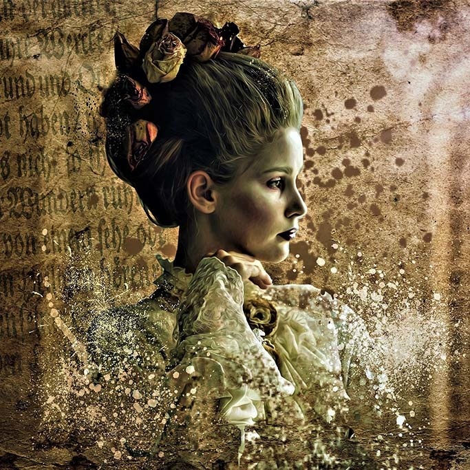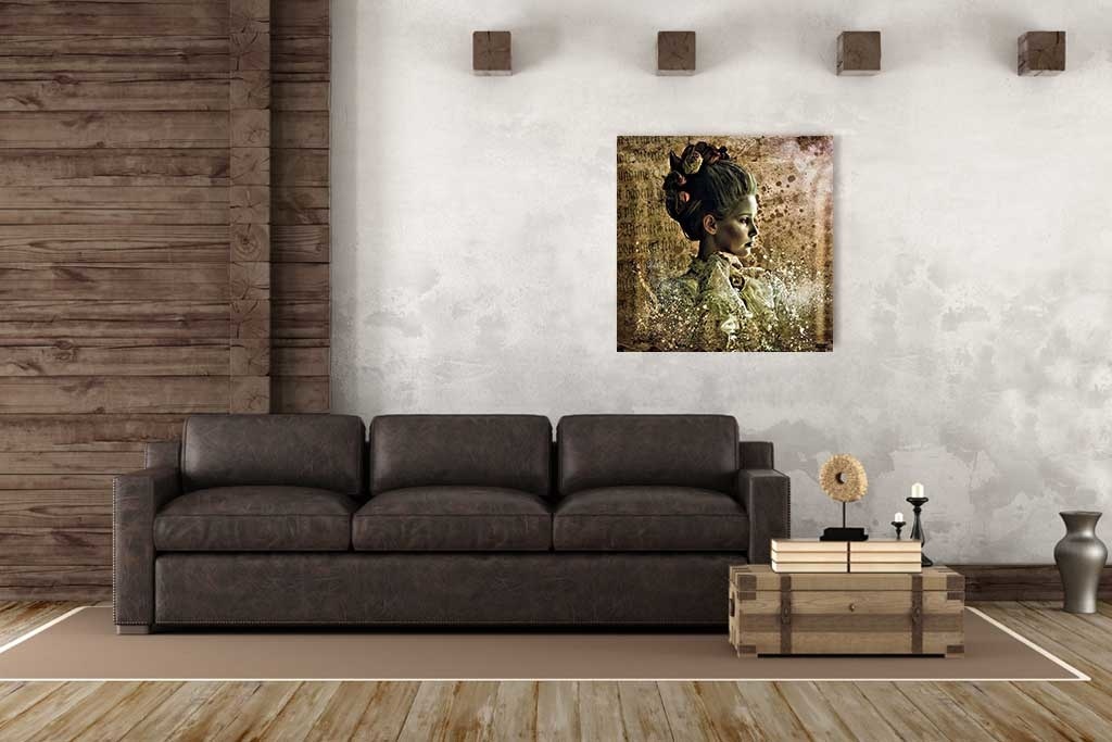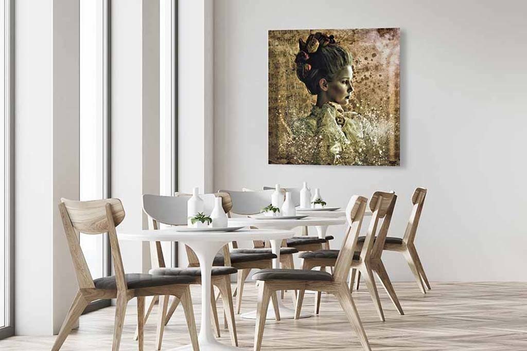 Ein geheimnisvolles Porträt einer jungen Frau. Auf dem Bild ist sie in einem weißen Kleid und mit Rosen im Haar abgebildet. Obwohl die Frau wie ein Geist aussieht, verleihen die Bronzetöne dem Ganzen eine warme Atmosphäre. Sieht in jedem Raum des Hauses schön aus.
