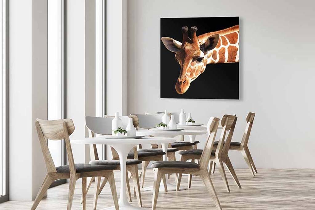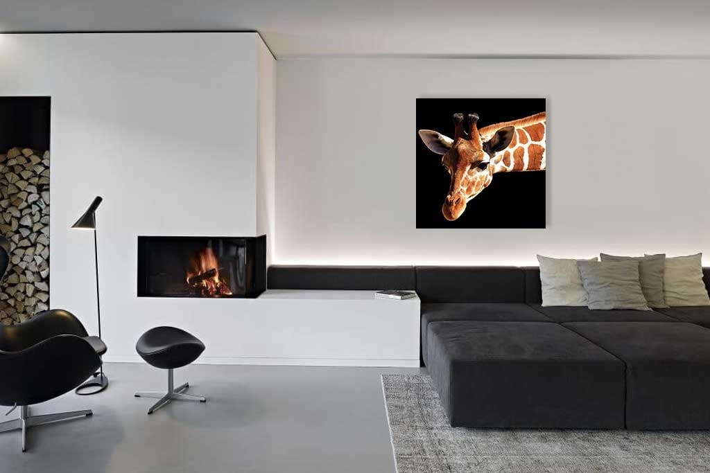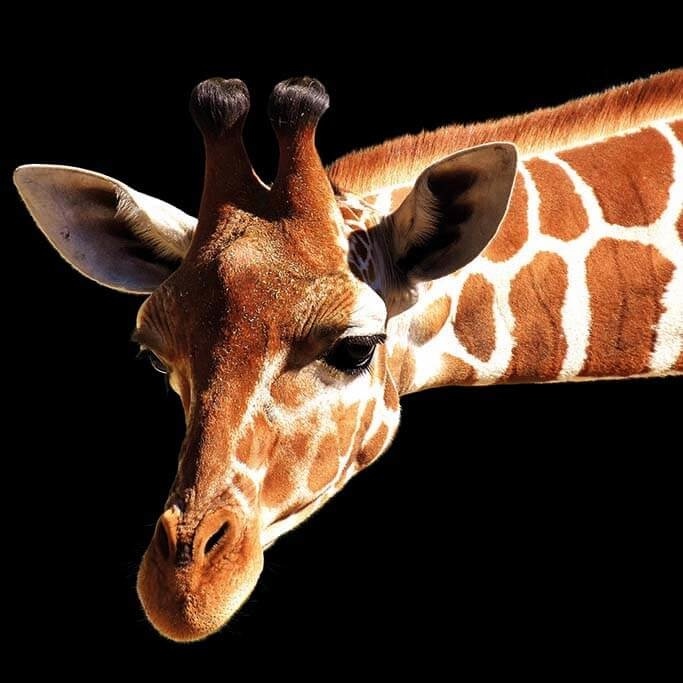 Nahaufnahme einer Giraffe mit schwarzem Hintergrund, schön zu kombinieren mit anderen Bildern.