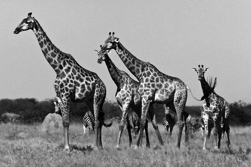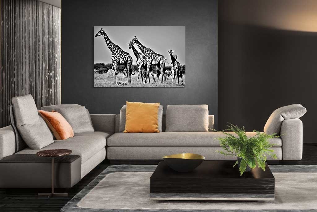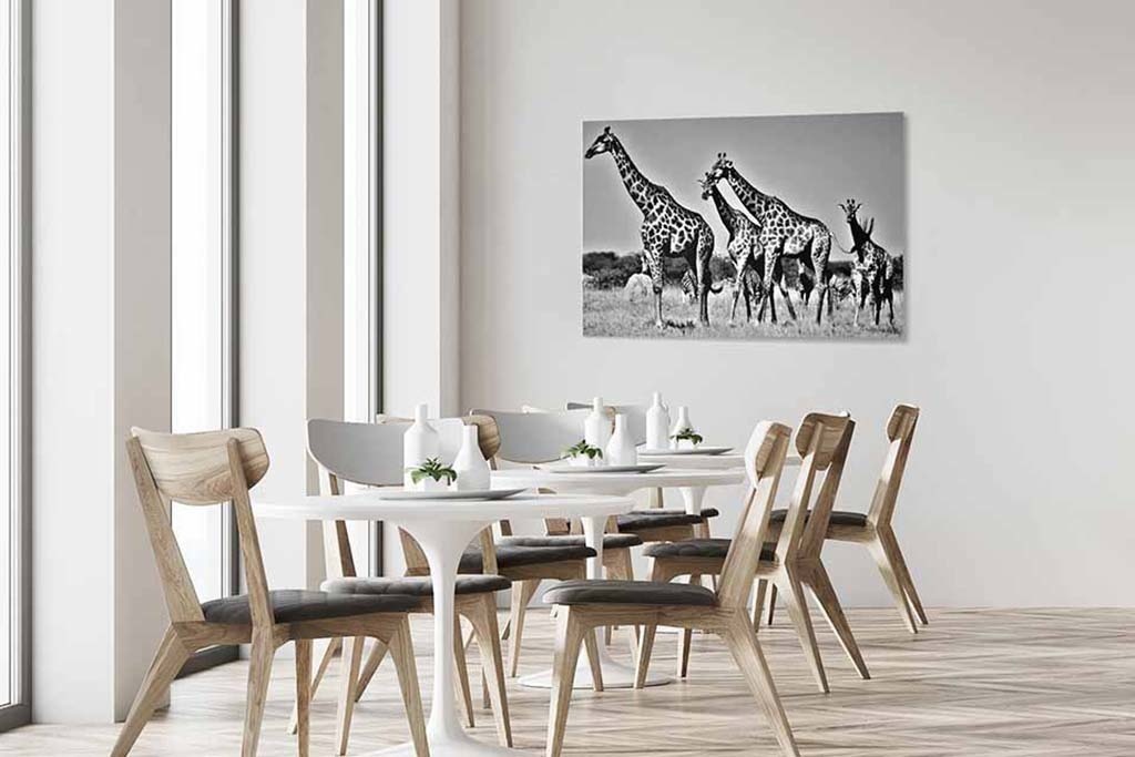 Gruppe von Giraffen in freier Wildbahn. Die Tiere laufen in der wunderschönen Natur Botswanas herum. Geeignet für alle, die Natur- und Tierfotografie lieben. Kombinieren Sie mit anderen Bildern der afrikanischen Natur und erstellen Sie Ihre eigene Fotoserie für die Wand. Passt in jeden Innenraum.