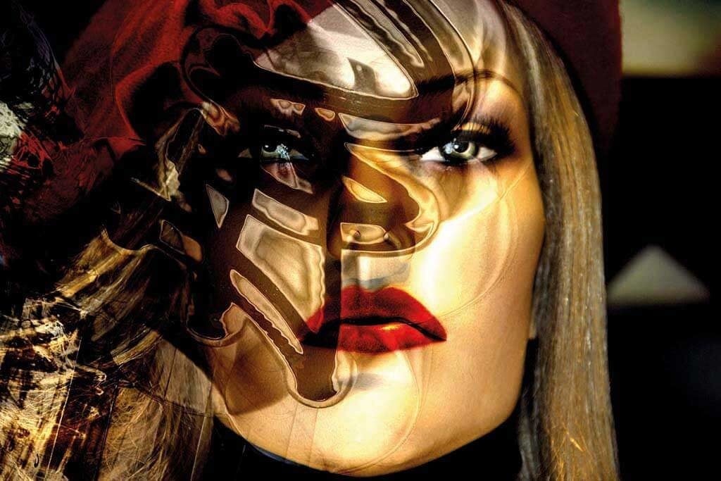 Spezielle Nahaufnahme eines mit Glitter bedeckten Frauengesichts. Der goldene und rote Glitzer führt zu einem beeindruckenden Effekt und sorgen dafür, dass das Bild sofort ins Auge springt. Brillantes, warmes, intensives Glühen. Für alle, die ein Bild suchen, das auffällt. Sieht in jedem Raum des Hauses gut aus.
