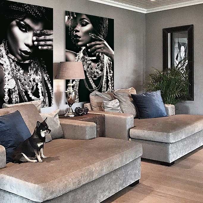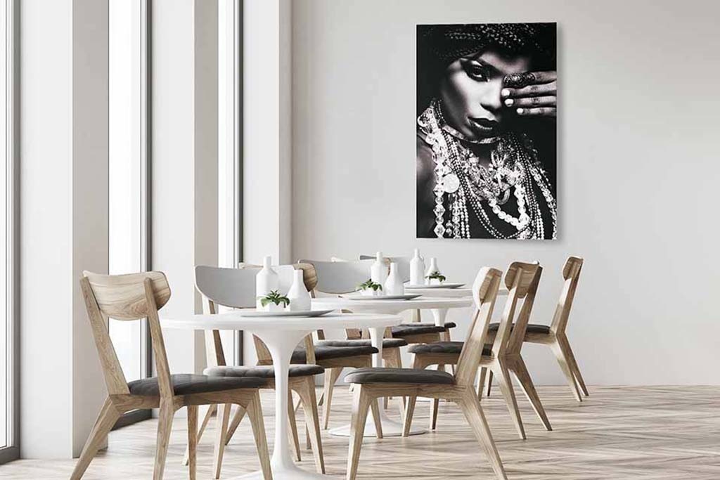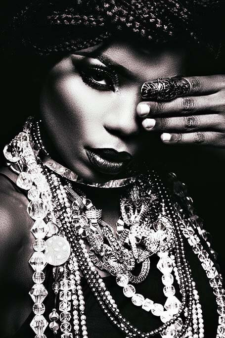 Schönes Porträt einer glänzenden Frau, dessen Kontraste das Bild von der Wand abheben. Eine Fotokunst, die auffällig präsent ist, aber nie langweilig wird.